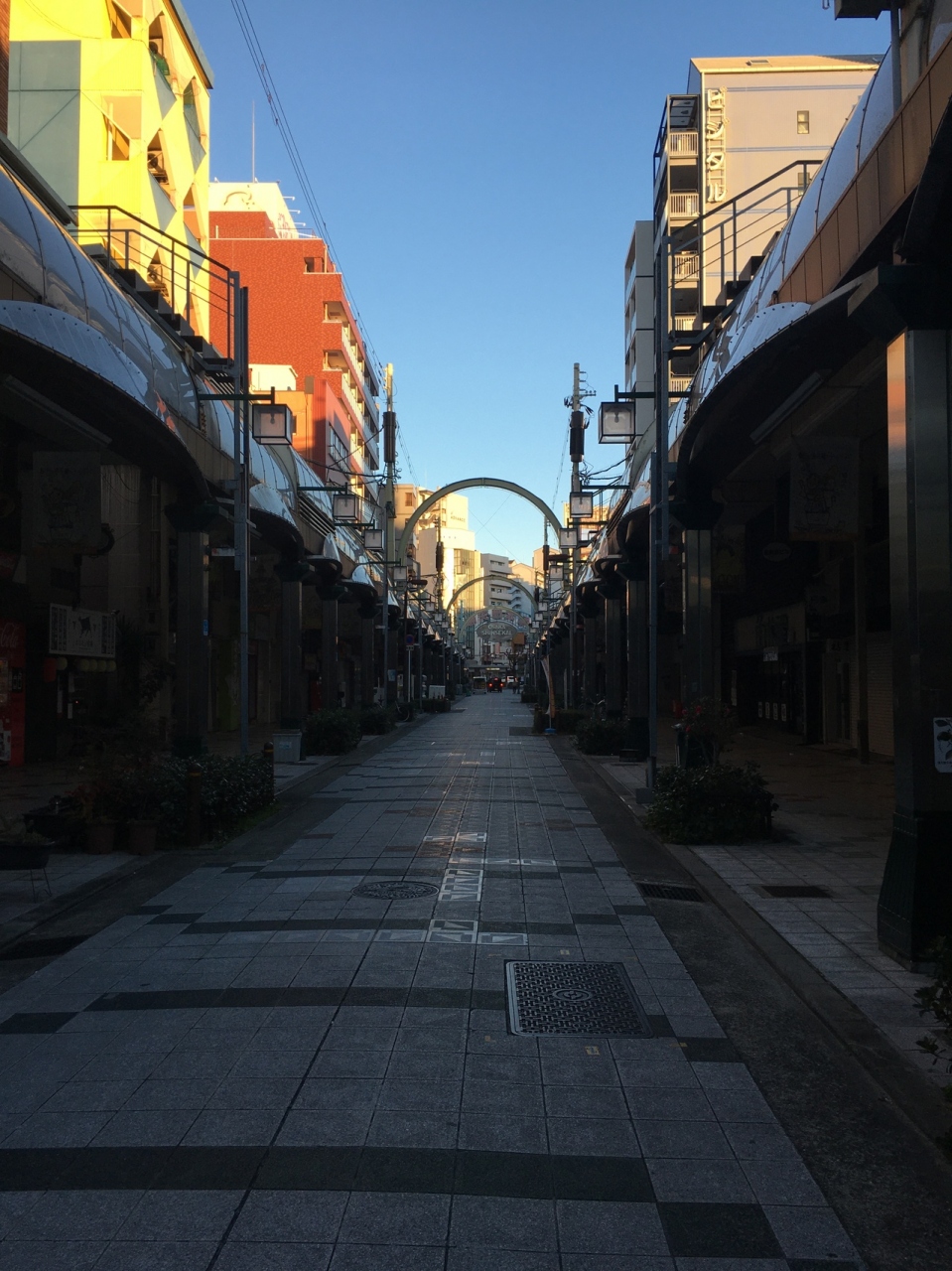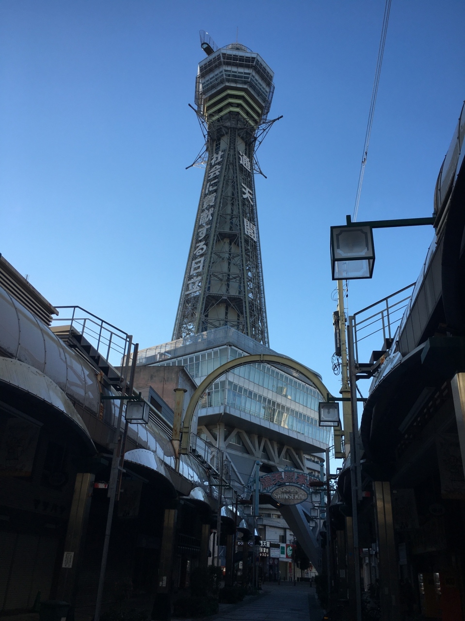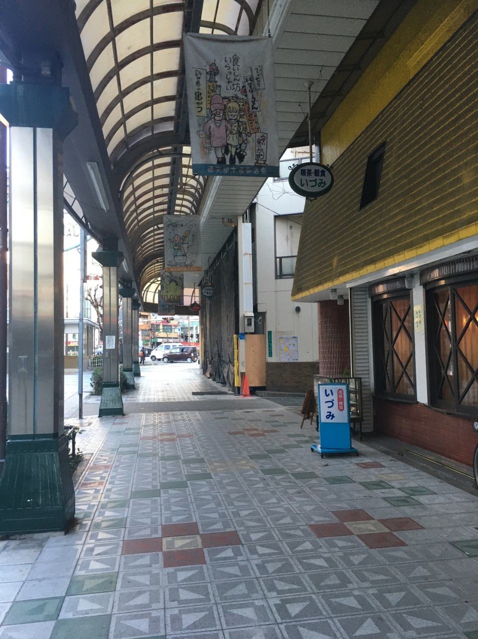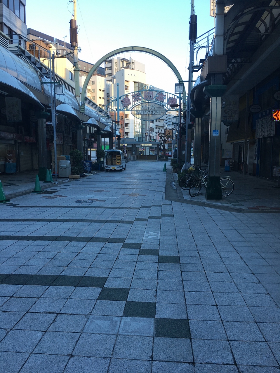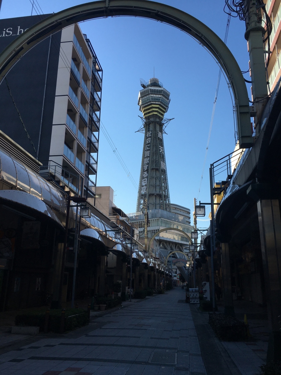 地下鉄恵比須町駅の地上出口上にあり、通天閣まで真っ直ぐ続く商店街で地元で密着型というより観光客向けの店が多かったです。道幅が広めのためか人は少ないような感じでした。左右の歩道には屋根があり中央は車道です。