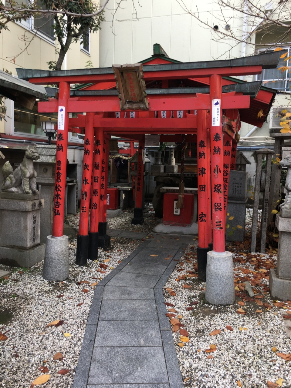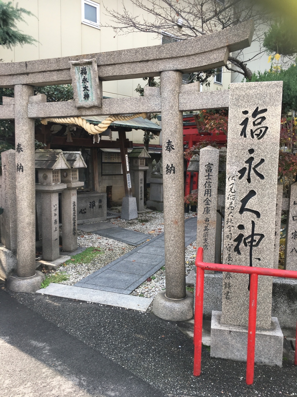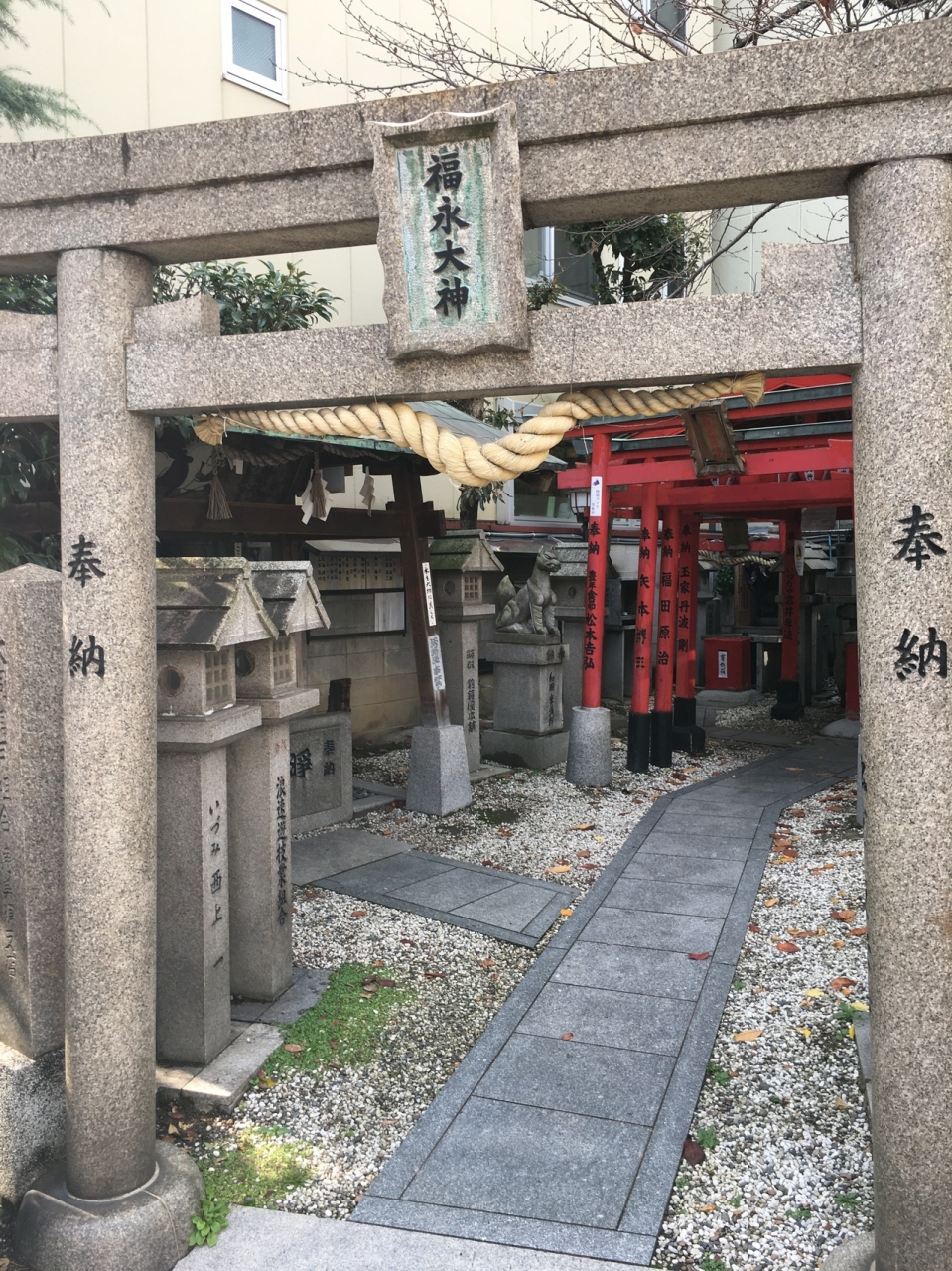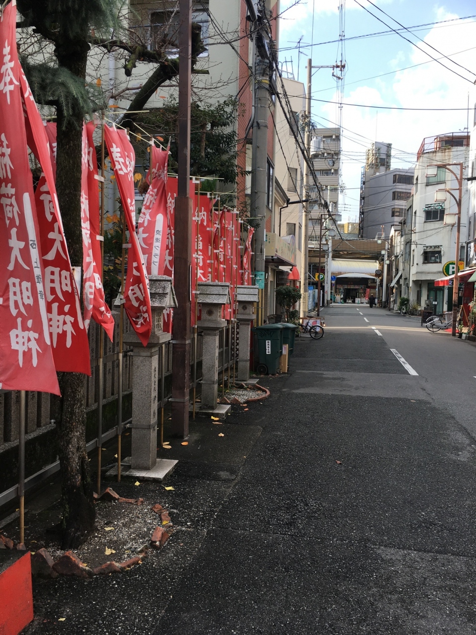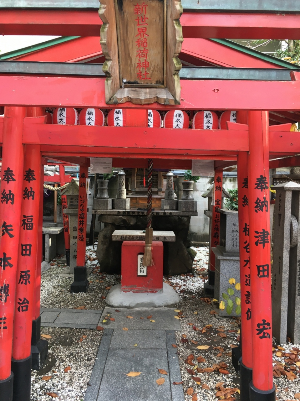 狭い福永大社内にあって、境内に入るとすぐに赤い鳥居がいくつか続き、賽銭箱の後方に祠がありました。鳥居の上には提灯がぶら下がり、大社の周りには赤い幟が何本か立っていました。大社出て右に行くと徒歩3分ぐらいで通天閣です。