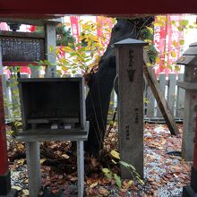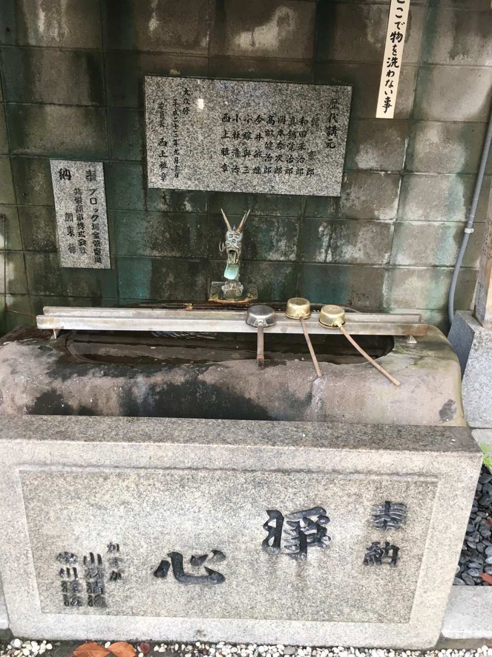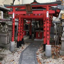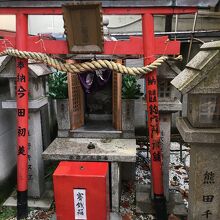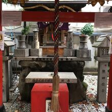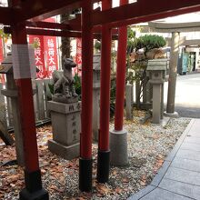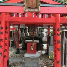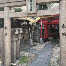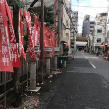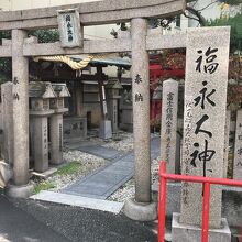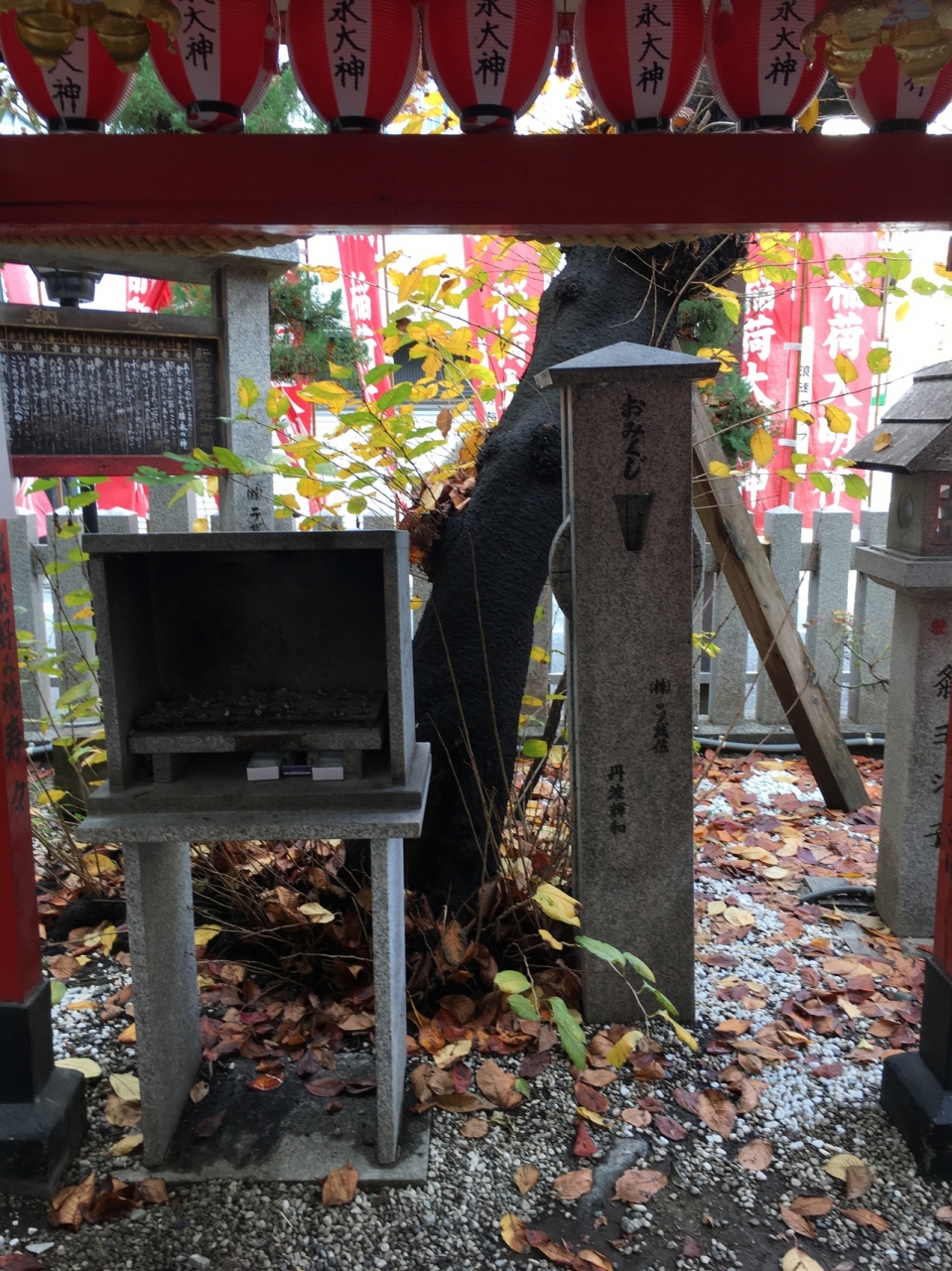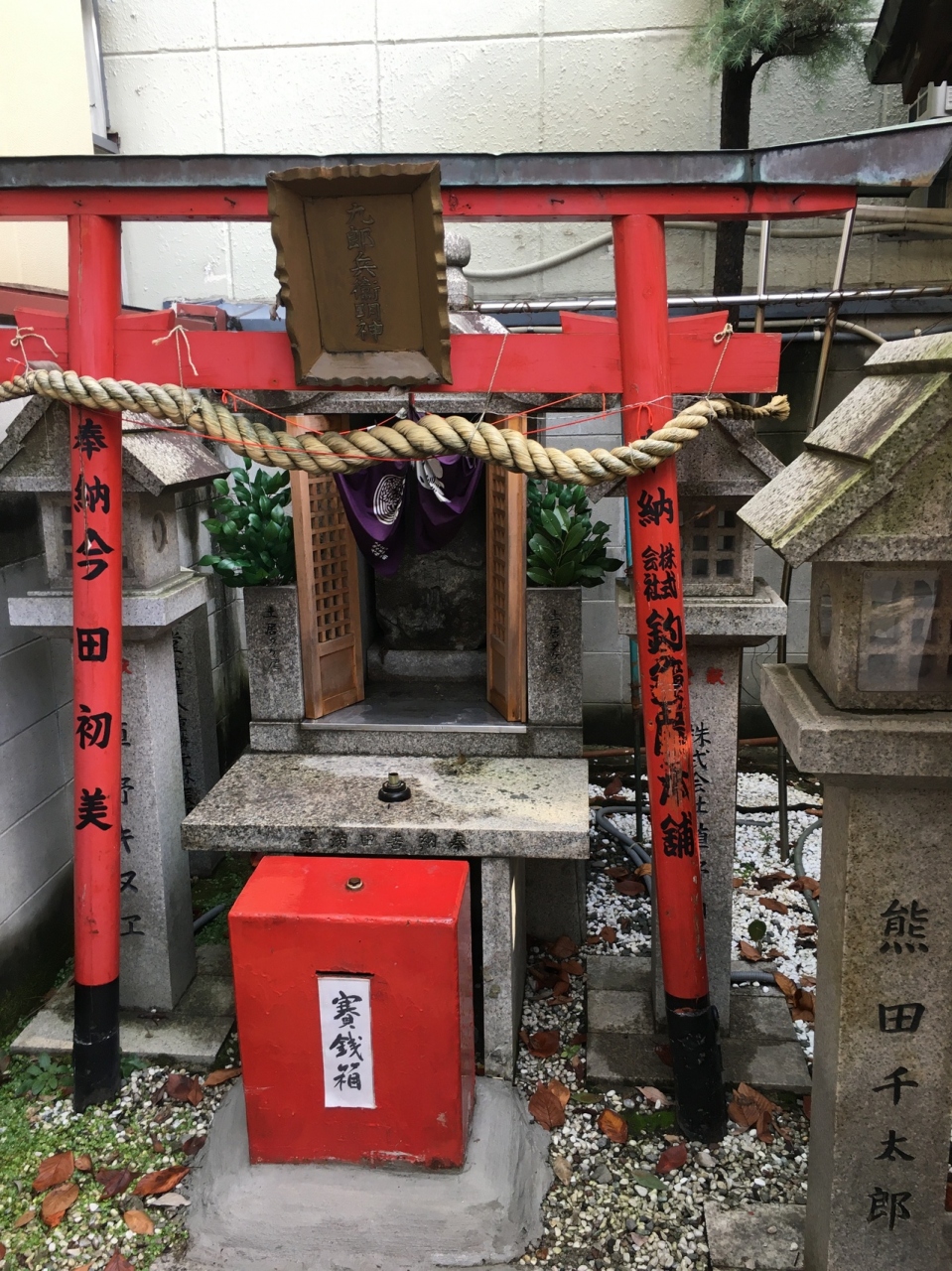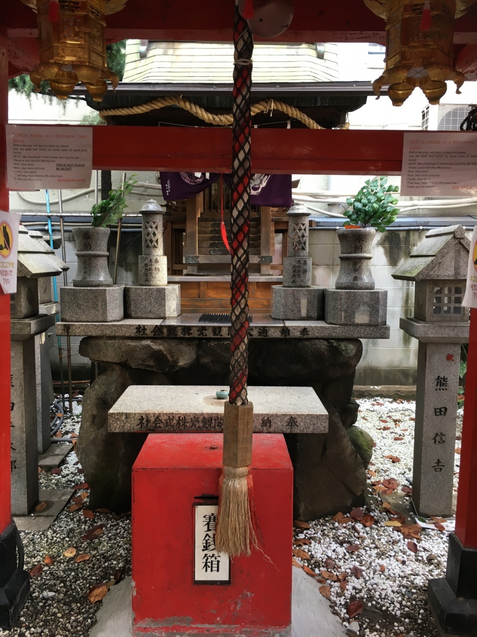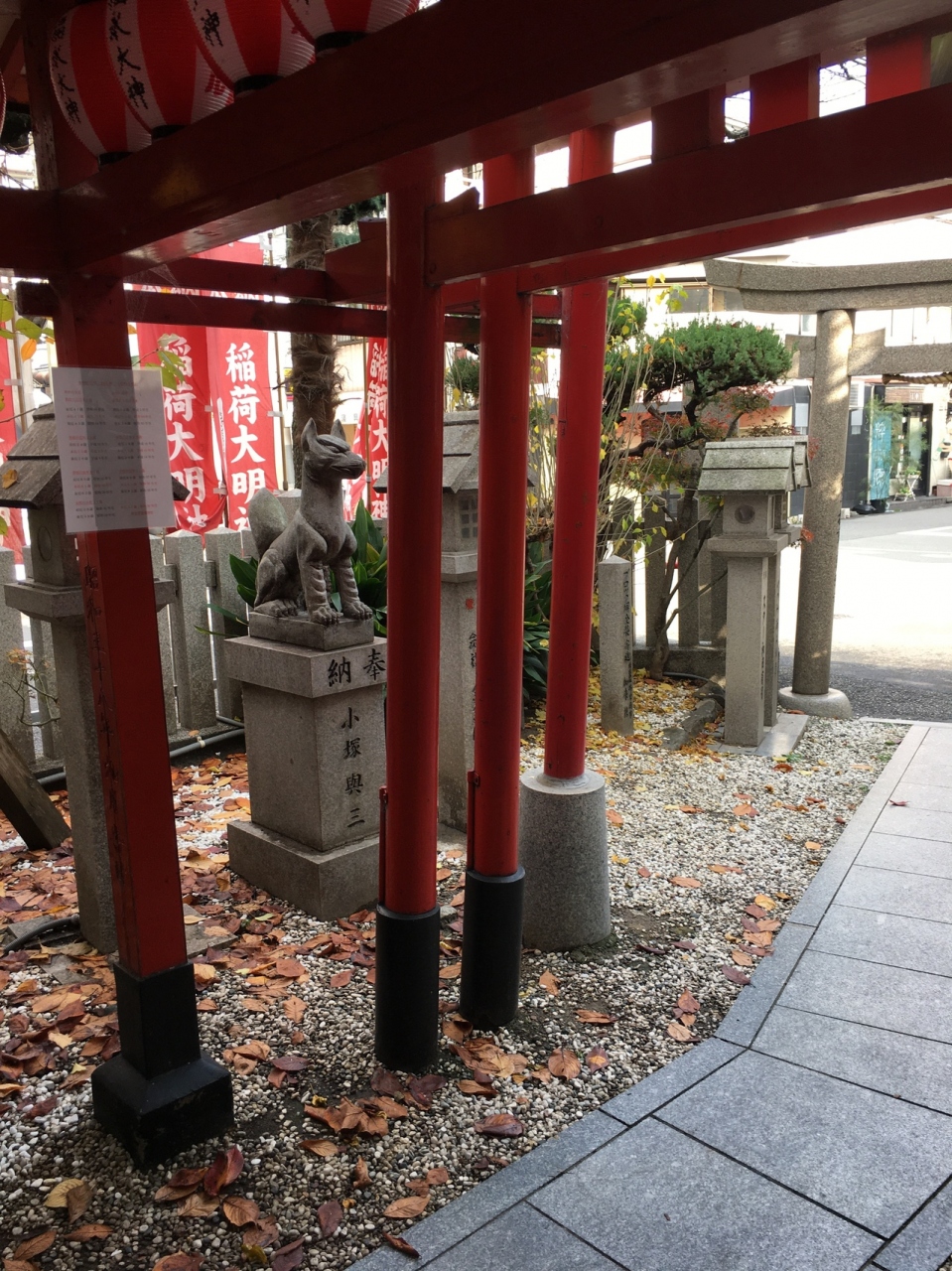 狭い福永大社内にあって、境内に入るとすぐに赤い鳥居がいくつか続き、賽銭箱の後方に祠がありました。鳥居の上には提灯がぶら下がり、大社の周りには赤い幟が何本か立っていました。大社出て右に行くと徒歩3分ぐらいで通天閣です。
