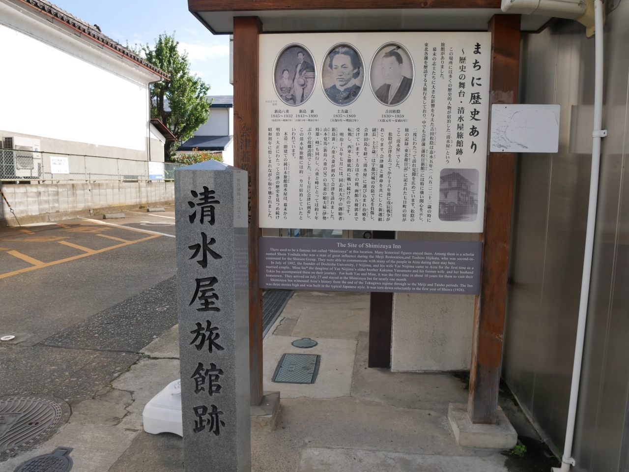 吉田松陰等歴史上の人物がここにあった「清水旅館」宿泊したということですが、今は駐車場になっていて看板と石碑があるだけで旅館は影も形もありません。