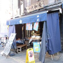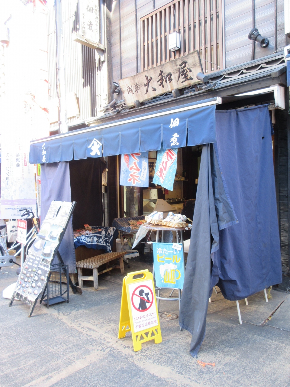 伝法院通りの伝法院側にあります。伝法院側のどの店も間口が狭いのが特徴です。店頭にラムネ、ビール、アイスの看板が出ていますが、佃煮屋です。昆布の佃煮など袋詰めされた商品がテーブルに置いてありました。隣の店に行列ができるので、店の敷地を確保するためでしょうが、青い布で覆っていて入口が狭く入りにくい雰囲気でした。