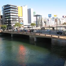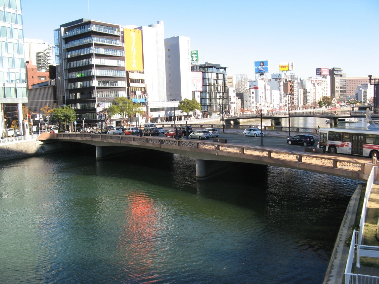 明治通りが那珂川に架かっている橋です。主要道路なので交通量は多く、片側2車線の車が走れる大きな橋で橋の向こう側はオフィスビルが並んでいて都会的な雰囲気を感じるところですが、観光的には特別感はありませんでした。橋のたもとにある「水上公園」は、ちょっとした休憩スポットになります。