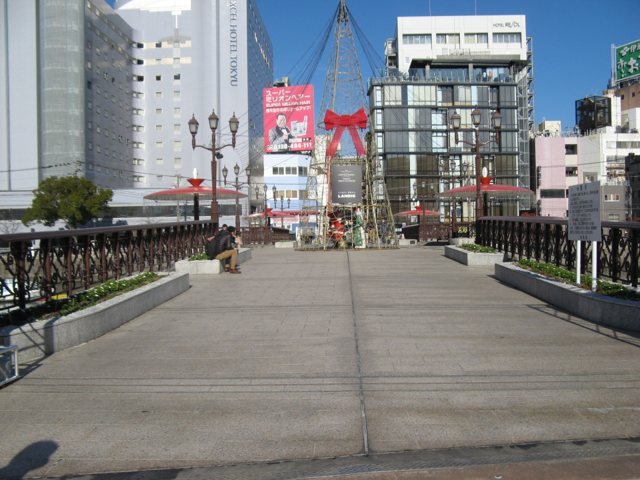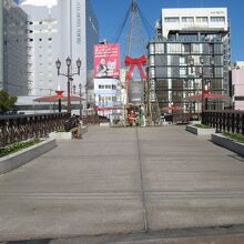 天神中央公園から中州へ渡る那珂川に架かる橋のひとつです。歩行者専用橋で中央には円形の広がった場所が二か所あり、ベンチなども設けられていて休憩したり、ゆっくり景色を眺めたりできるようになっています。中洲側の橋のたもとには「三人舞妓像」などもあります。