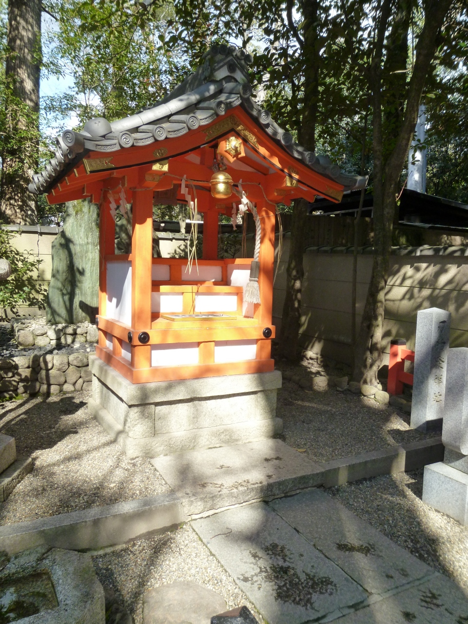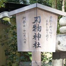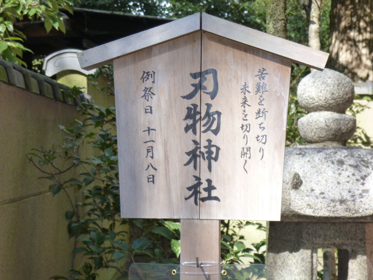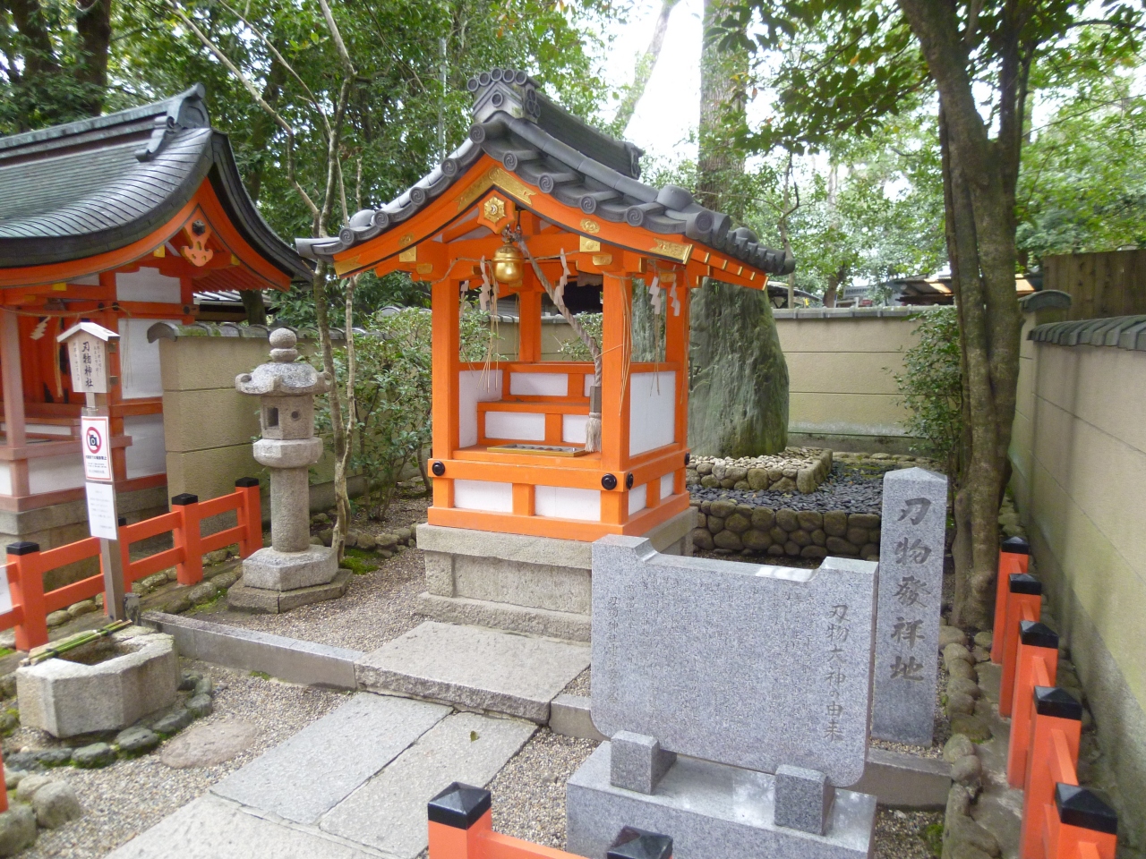 刃物社は、八坂神社の末社で、本殿の北に位置しています。刃物社に向かって、右側には日吉社、左側には祖霊社があります。刃物社の御祭神は、製鉄・鍛冶の神「天目一箇神」です。この神様は、神様たちが使う武具などを作っていたそうなんです。またこの神様は名前の通り『目がひとつ』のお姿だったようです。毎年11月8日には『ふいご祭』が行われています。この日に刃物を持っていくと、無料で包丁を研いでくれたりするみたいです。