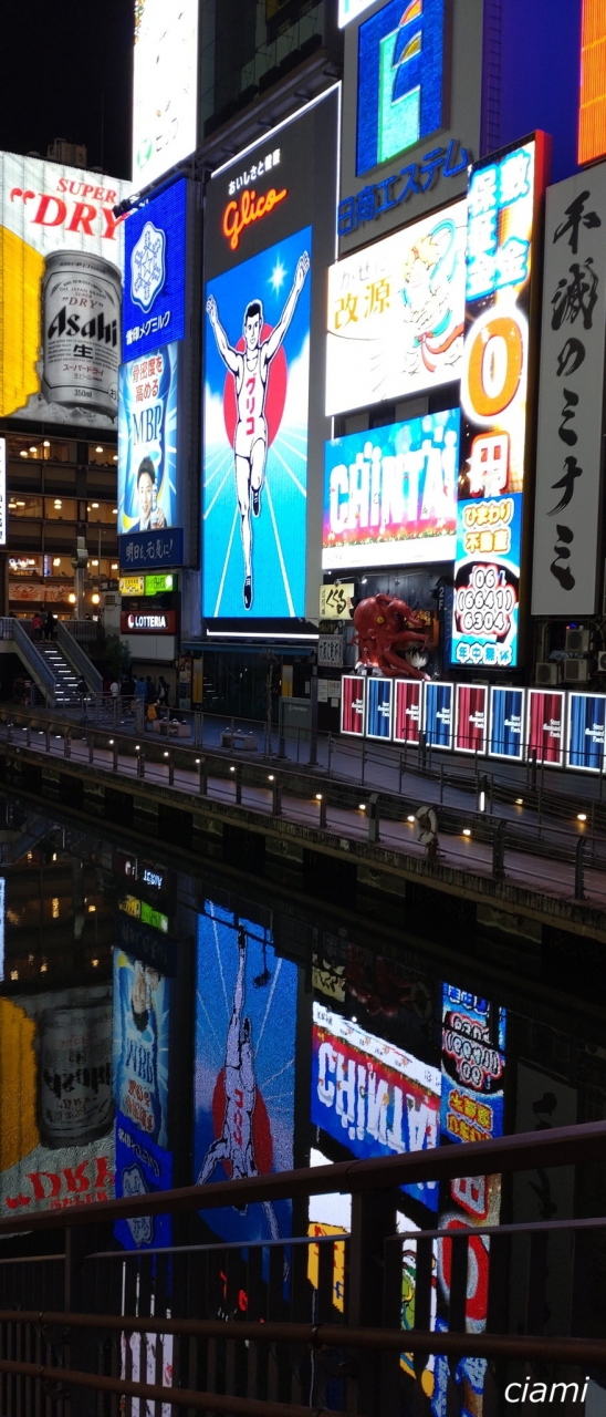 周りの強烈な看板と一緒に、道頓堀川にネオンが映るので、インパクト強いです。