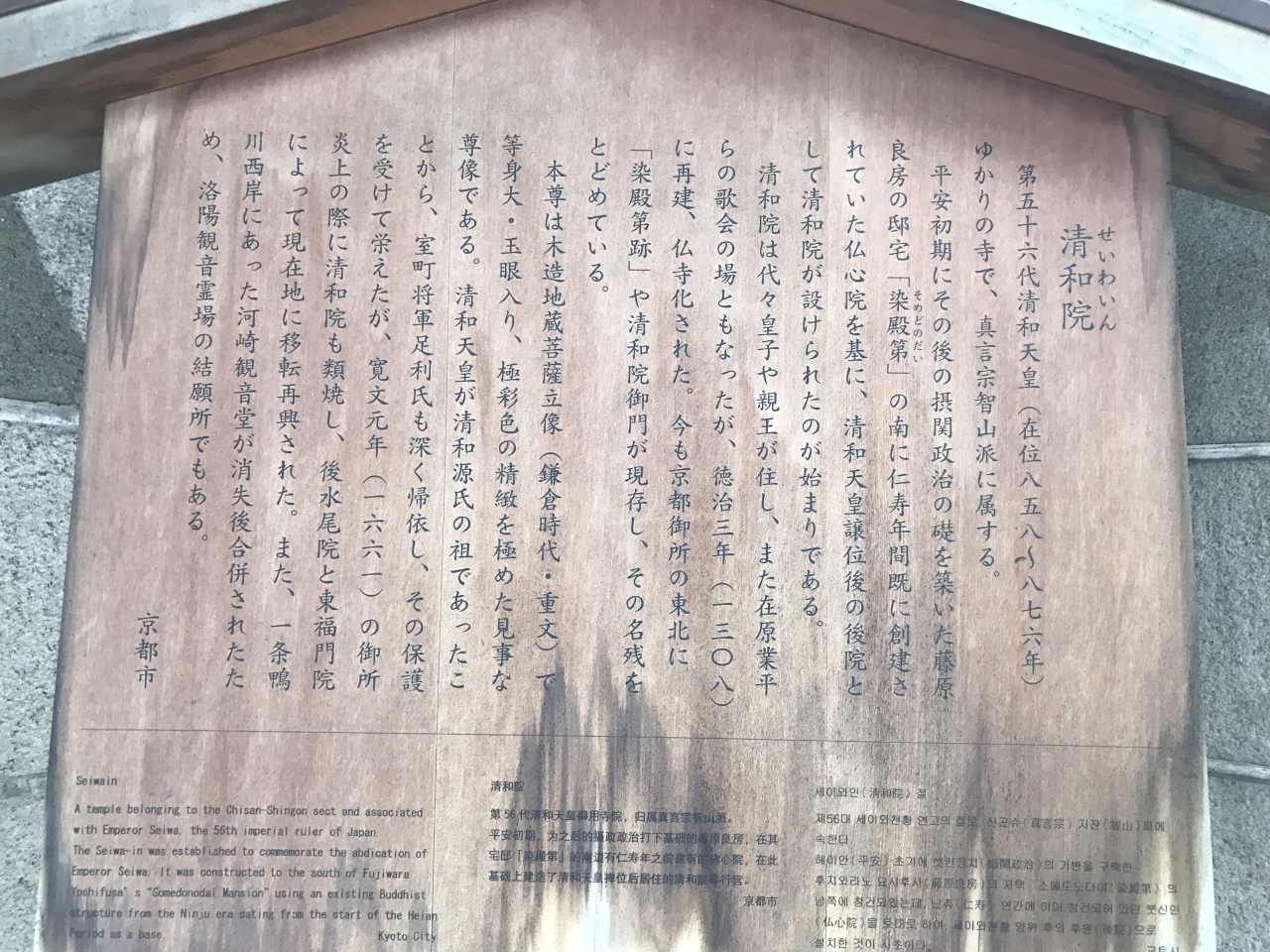 清和院は、地下鉄「今出川」から西へ徒歩10分くらいの場所にあり、真言宗智山派の寺院です。本尊は地蔵菩薩で、通称を清和地蔵尊もしくは玉体地蔵尊とも呼ばれています。藤原良房邸(染殿第)の南に文徳天皇が染殿后の請い、仏心院を建てて地蔵菩薩を安置したのに始まっています。鉄筋コンクリート建てのお堂の中に立派な仏様が安置されていました。