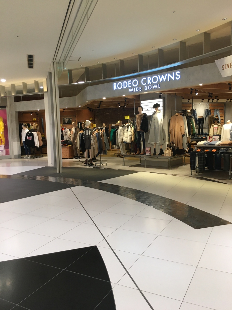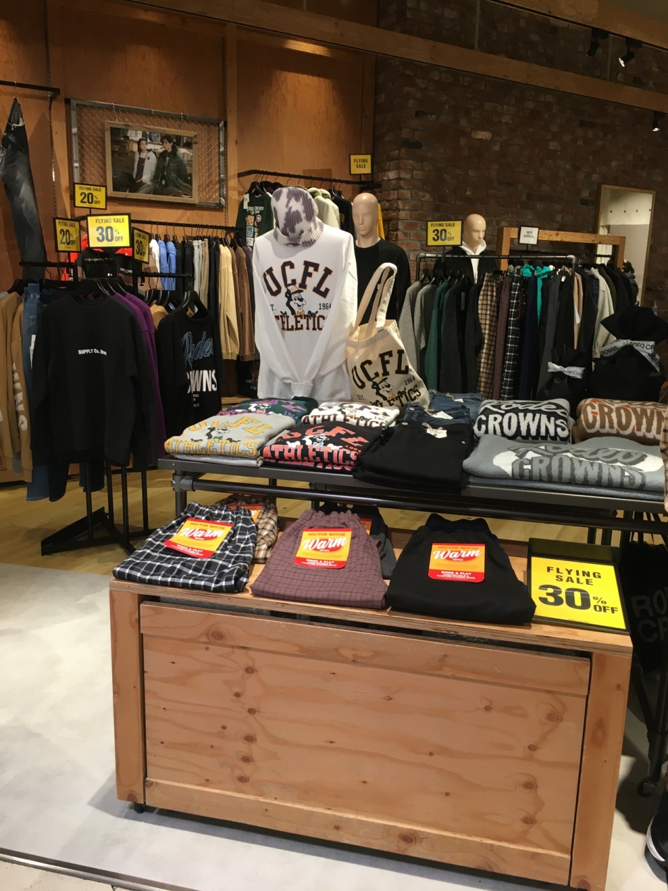 通路が半円形ぽいので店舗も半円形になっていてドアや敷居がないので出入りしやすい感じでした。マネキンがたくさんあり、若者向けの店カジュアルな店で帽子等も置いてありました。セール中の黄色い札が目立ち30%オフが多かったです。