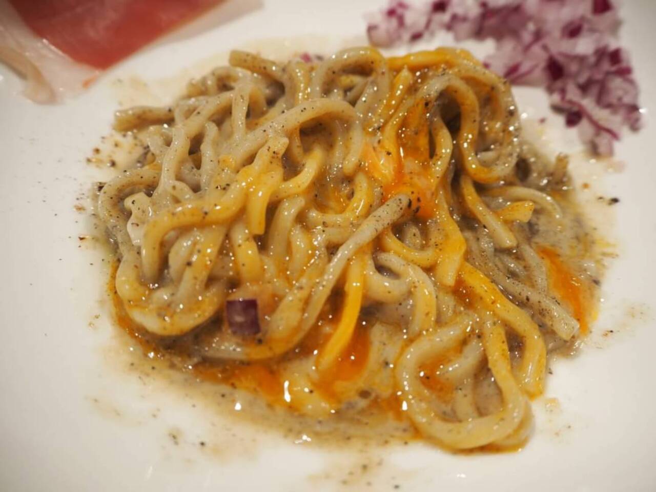 様々なメニューがありますが煮干しベースの出汁が聞いたヌードルで、ニボニボナーラというカルボナーラと煮干しのつけ麺が合わさったようなふしぎなメニューを頼みました。