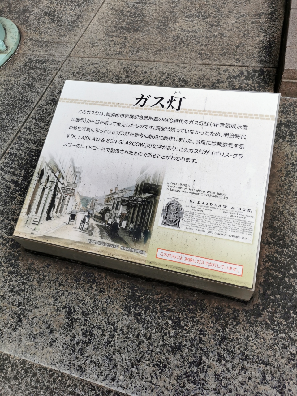 横浜観光。散歩も兼ねて旧い建物探訪です。関内駅からスタート。横浜公園から大桟橋方向に歩いていきました。日本大通りは横浜公園から海岸通りに向かう広い通り。11月後半で日本大通のイチョウが真っ黄色に紅葉していてとても綺麗でした。横浜ユーラシア文化館は地下鉄日本大通りの真上です。1Fと裏庭は無料です。駐車場側の裏庭には「明治期のガス灯」が立っています。他にも「横浜市瓦斯局ガスタンク基礎」「卵形下水管」「国内最古のガス管」などの歴史遺物が展示されていて興味深いです。