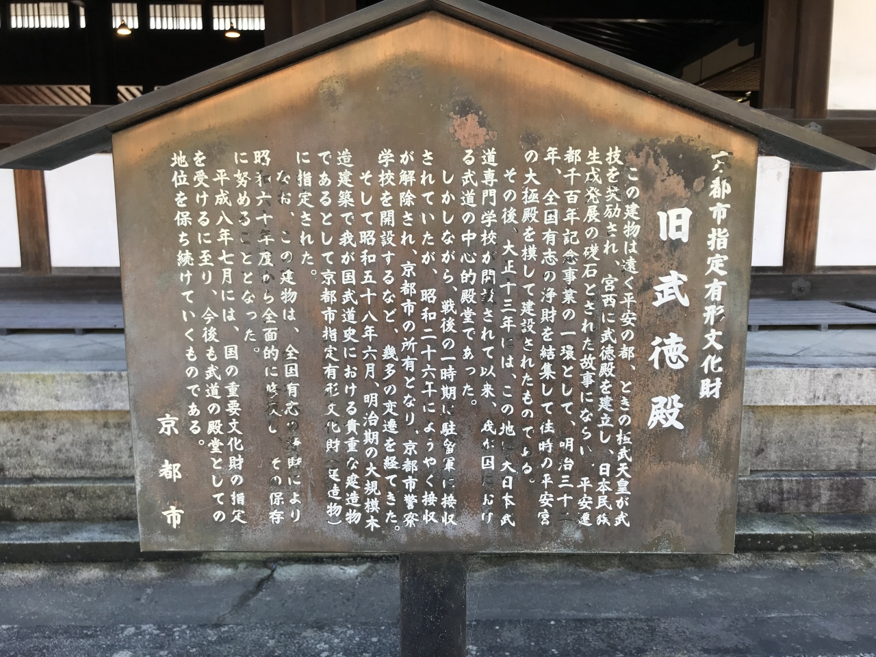 日本最古の演武場「旧武徳殿」のほか主競技場、弓道場、相撲場などを備える総合武道施設です。このうち、旧武徳殿は明治時代に隣接する平安神宮と同じく平安遷都1100年記念事業の一環として建設され、戦後、国の重要文化財に指定されています。私が旧武徳殿を初めて見学しましたが、とても素晴らしくて感動しました。ここは、現在でも武道愛好者の聖地として有名な場所です。