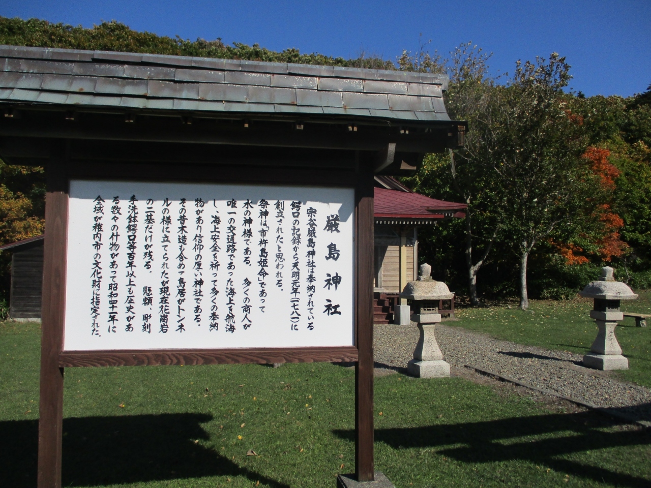 稚内市街地から、宗谷岬に向けて車を走らせている途中、国道を少し右に入ったところにありました。市杵島姫命(いちきしまひめのみこと)という水の神をまつる小さな神社ですが、かなり古い歴史を持っているようです。訪れる人もほとんどおらず、とても静かで落ち着いた雰囲気の神社でした。