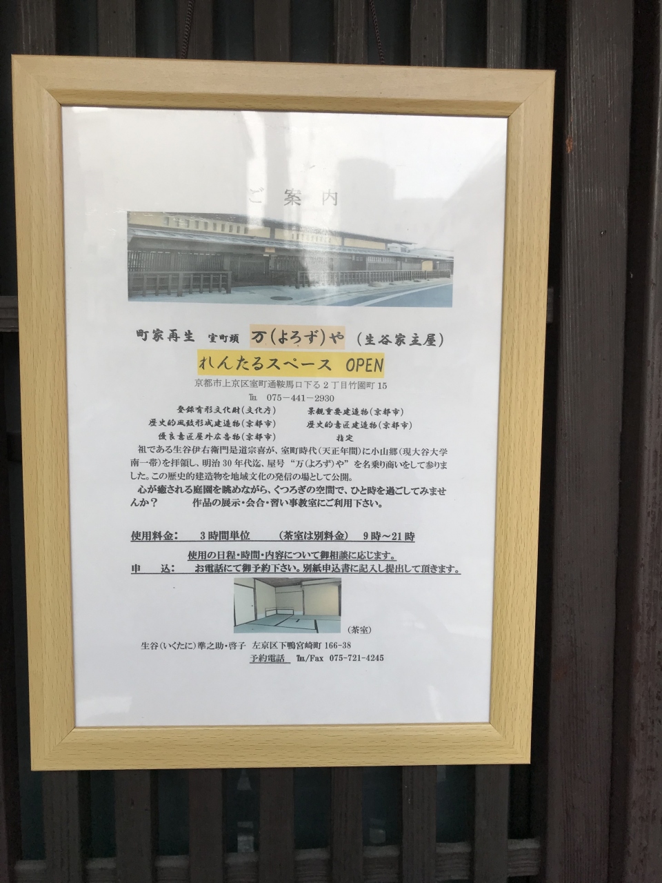 生谷家住宅は、地下鉄「鞍馬口駅」から上御霊前通を西へ少し進むとあります。江戸末期に建てられた京町屋、表には、「登録有形文化財」のマークがありました。明治30年代まで、「万や」の屋号で青物問屋を営んでいた旧家で、普段は非公開のようです。現在はレンタルスペースとして活用されているみたいでした。