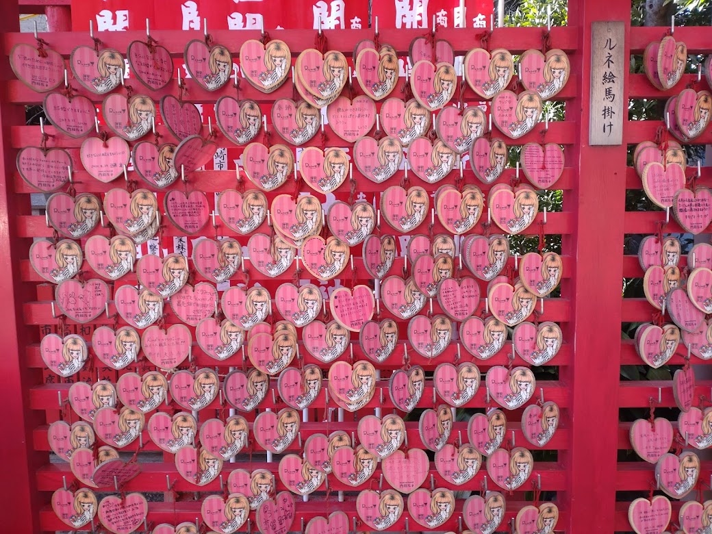 岡崎公園の東側、川沿いにある神社です。駐車場で迷いましたが、鳥居をくぐって境内にとめてよいようでした。ハートの絵馬に昭和テイストのかわいいイラストが描いてあるのは、岡崎に縁のあるイラストレーターの作品だそうです。