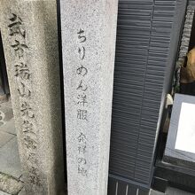 三条木屋町を下ったビルの前に「武市瑞山先生寓居跡」の石碑とともに「ちりめん洋服発祥の地」の石碑が並んで建っていました。昭和47年木屋町生まれの田中佐起三が、株式会社さきぞうを創業し、ちりめん素材を使った婦人ワンピース・スカート等の洋服を製造した記念碑と書いてありました。