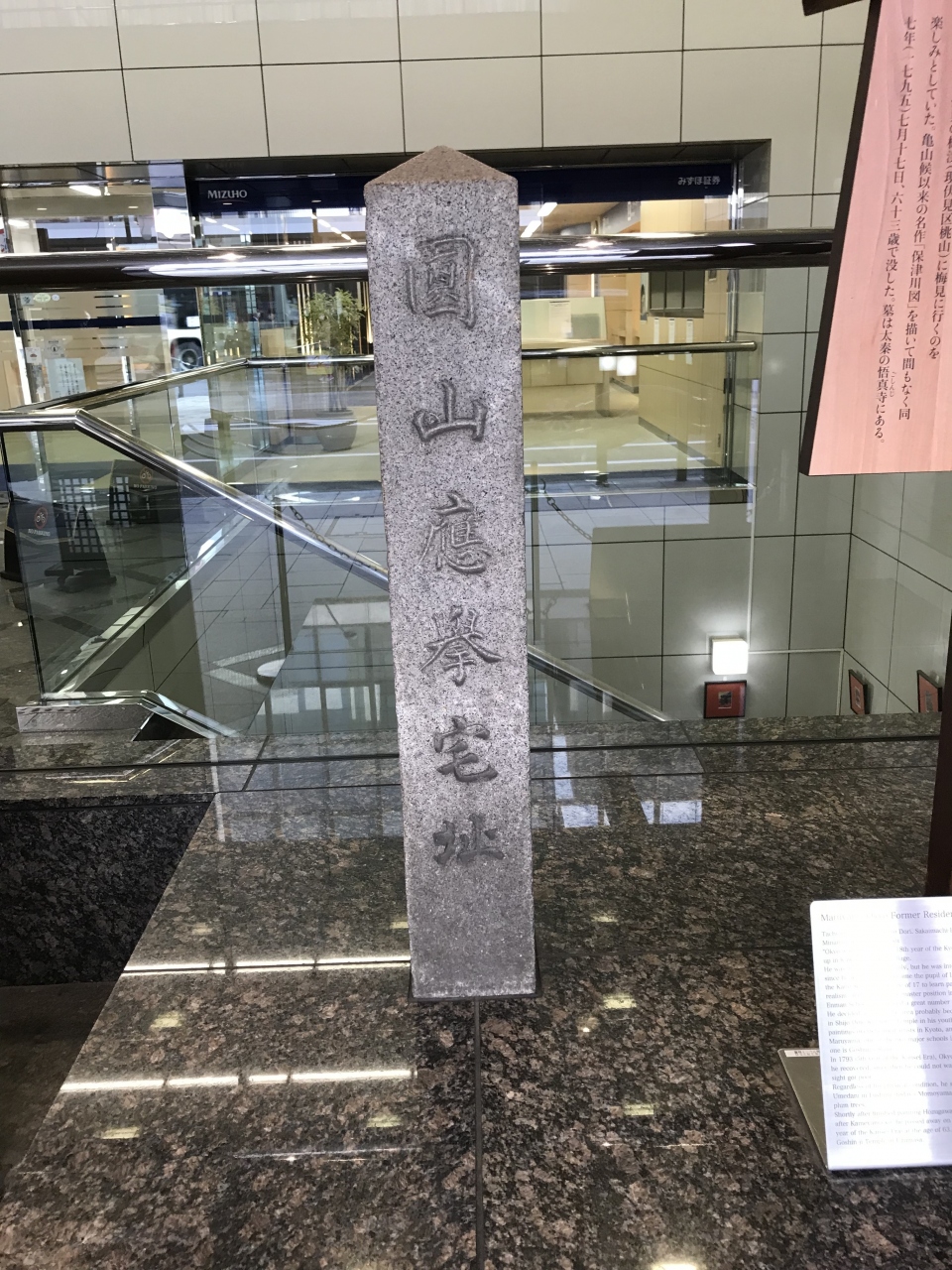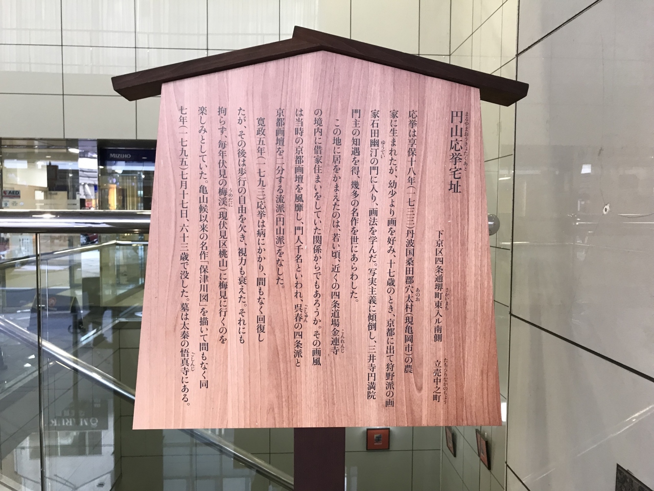 圓山応挙宅跡は、阪急電車「烏丸」から東へ徒歩3分くらいの場所にあります。圓山応挙は、丹波国出身の画家です。京都の石田幽汀に入門して,狩野派の画法を学びました。また宋元画の技術および西洋画の遠近法を加え,写実を重視した画風を興しました。応挙とその後継者は円山派と呼ばれました。