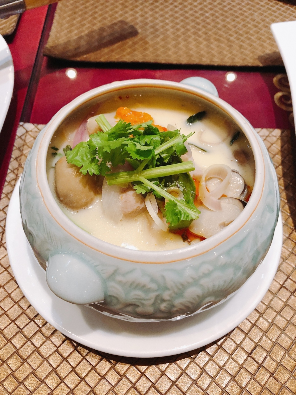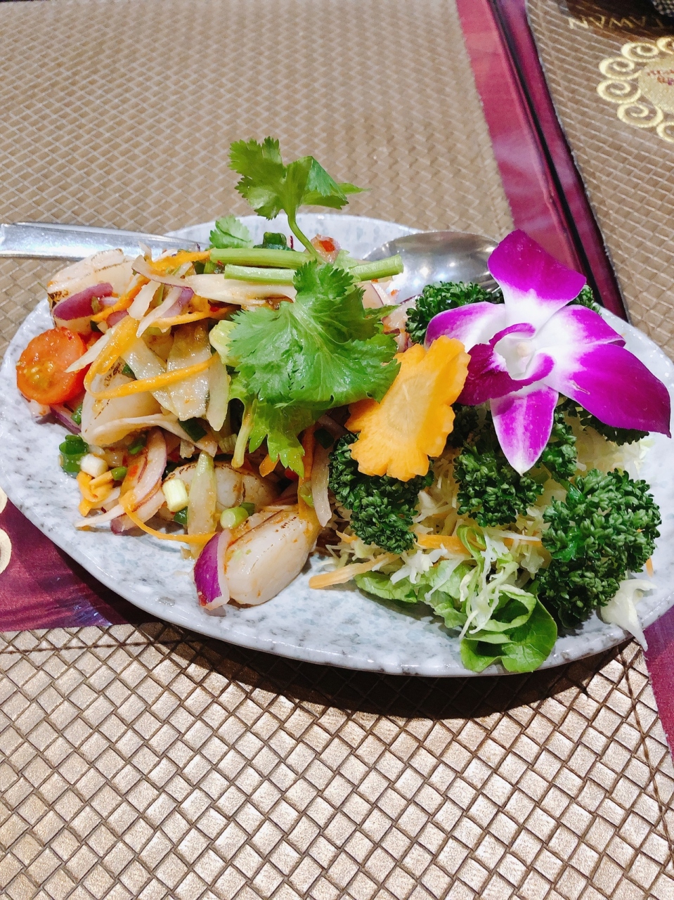 というわけでオーダーしたのはトムカーガイ、ホタテのサラダ、タラバ蟹の春雨炒め、太麺とシーフードの炒め。