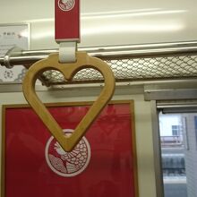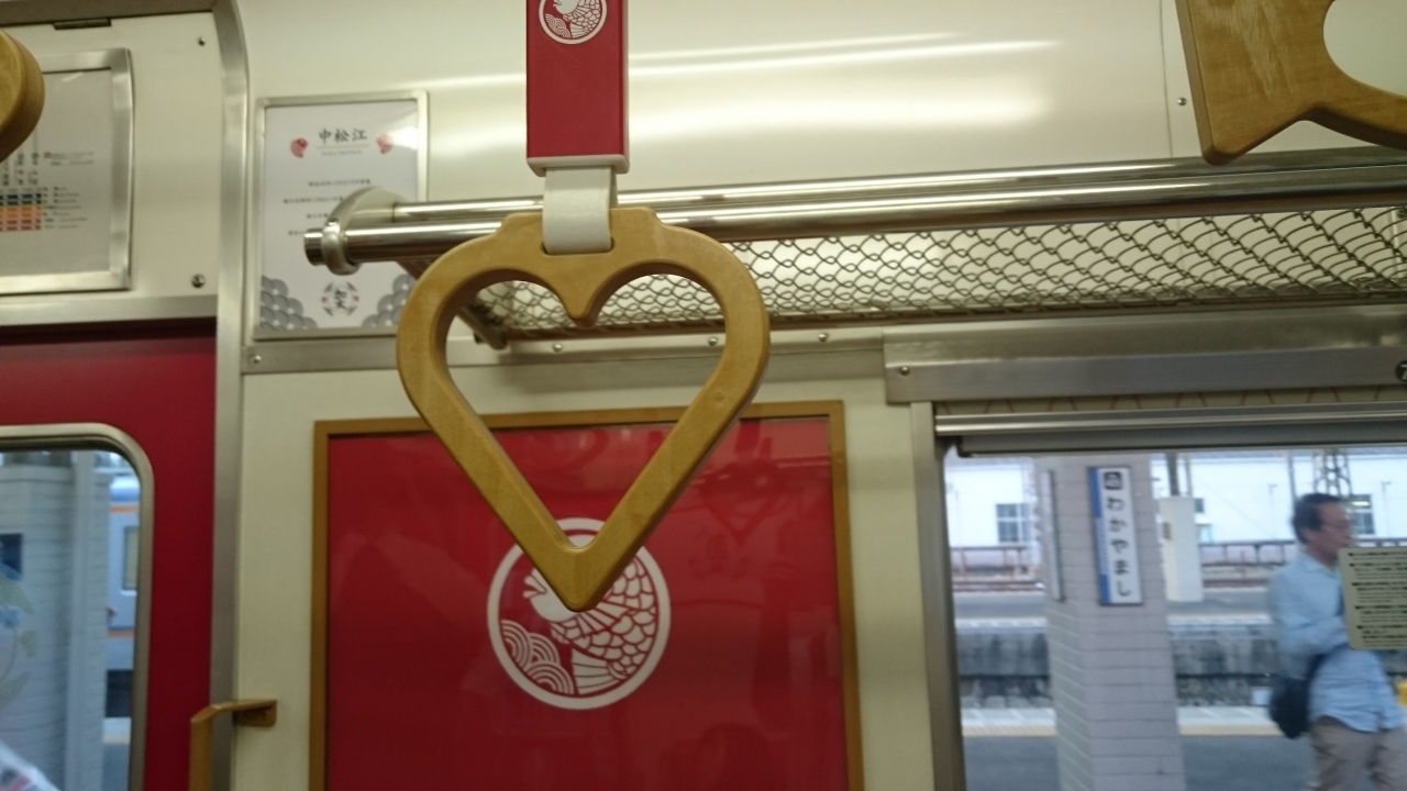 南海線には、加太線と多奈川線というローカル線を南海本線から走らせているが、加太線には「めでたい電車」という車両がはしっている。1つはピンク色、もう1つは淡いブルーの2編成がある。今回乗車したのはピンク色で地元の名産、真鯛をイメージしたカラーリングだ。車両は外装だけでなく内装にもこだわりがあり、つり革は魚のかたち、その中にハートのつり革も隠されるように作られている。