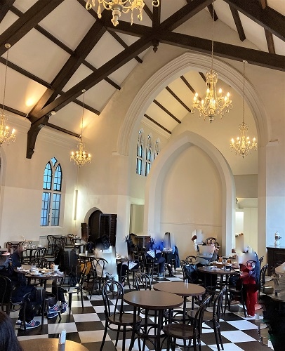 おしゃべりしながら歩いて着く感じです。教会をリノベーションした建物なので外観もとっても素敵。内装も古い感じと新しい感じが程よく混在していて落ち着く感じ。サンドイッチはセットを注文。