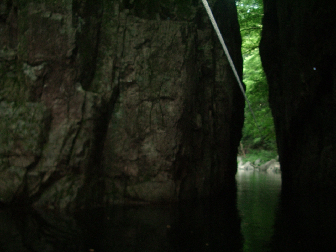 三段峡では三段滝と双璧を成す二段滝へ行く途中に抜けなければならない場所がこの猿飛だ。そこは猿飛と呼ばれる迫る岩の隙間で、猿が飛び通えること彷彿させる場所を小舟で渡り、二段滝へ向かうことになる。せりだす猿飛の岩をくぐっていくといきなりぱっと開ける姿はまるでペトラ遺跡のようだ