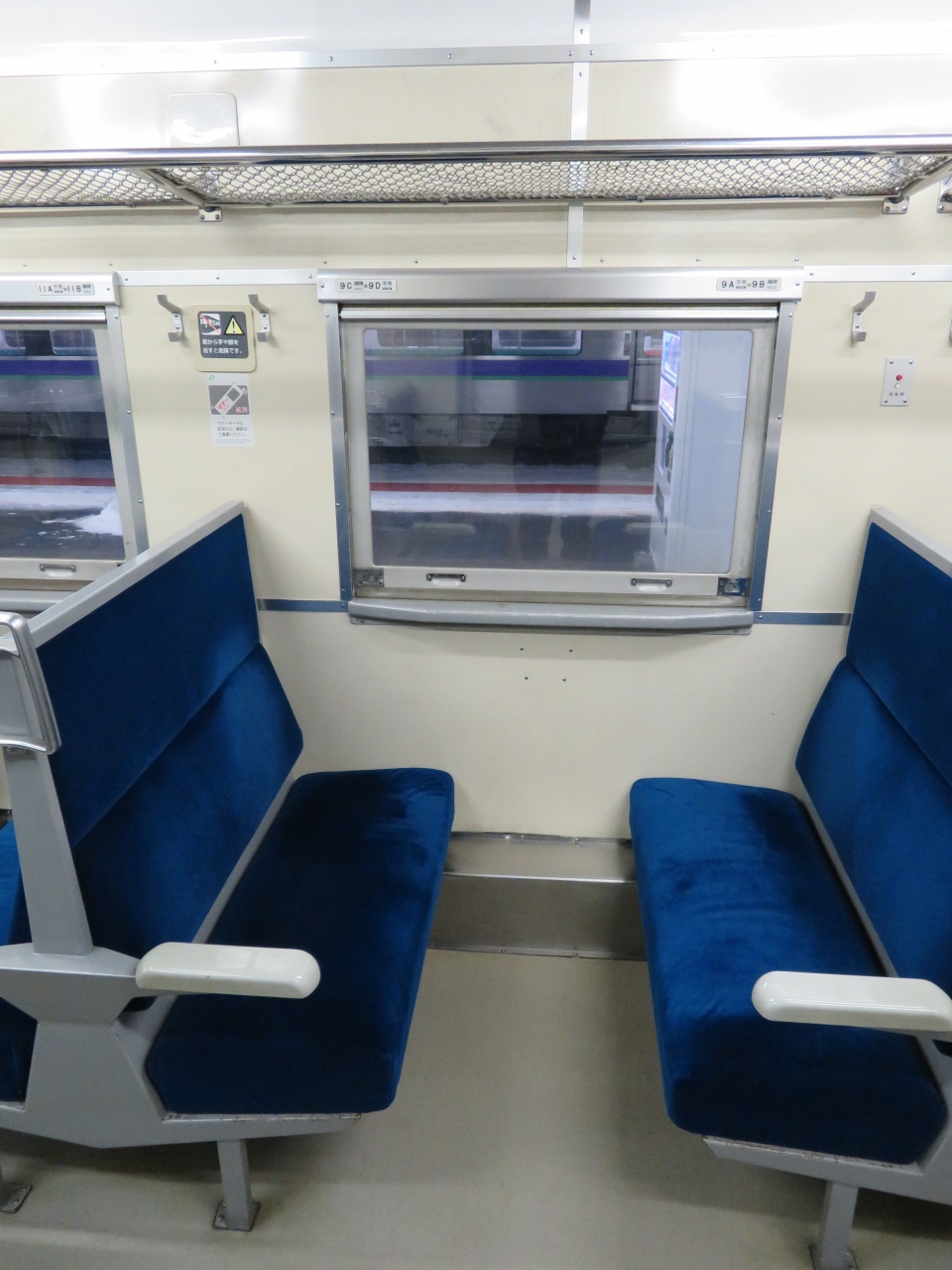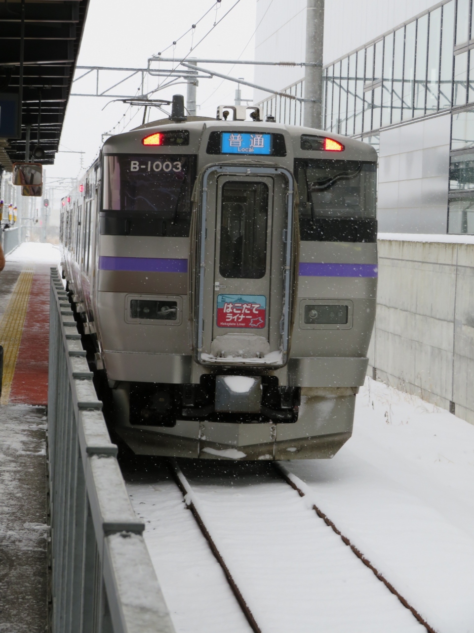 まず、『はこだてライナー』については、733系といふオールロングシート・3両編成の電車が使用され、混雑を避け先頭車に乗ったはいいものの、各駅停車タイプで新幹線連絡の他、近郊輸送も兼ねているため、五稜郭到着時、シートはほぼ埋まってしまった。