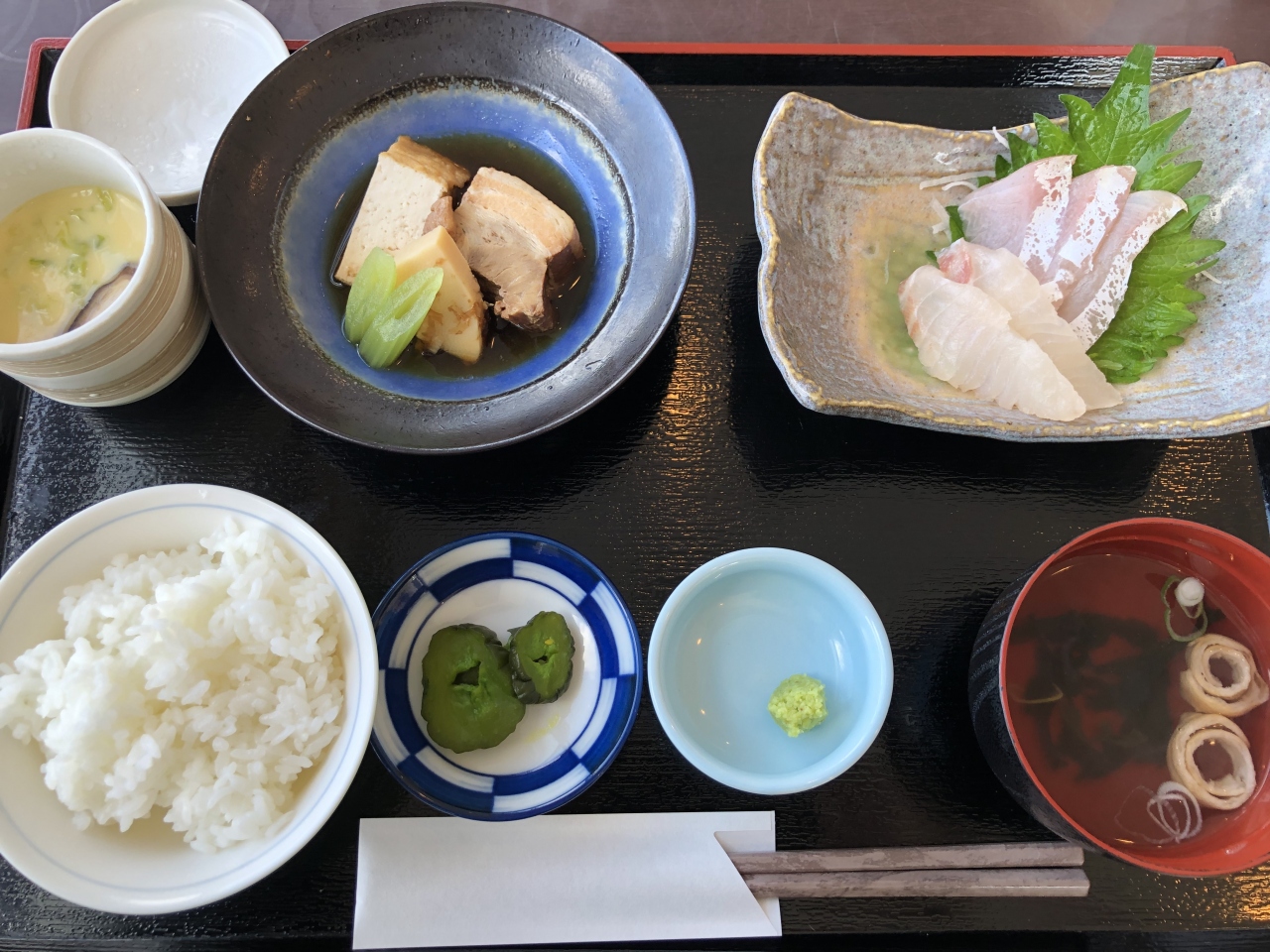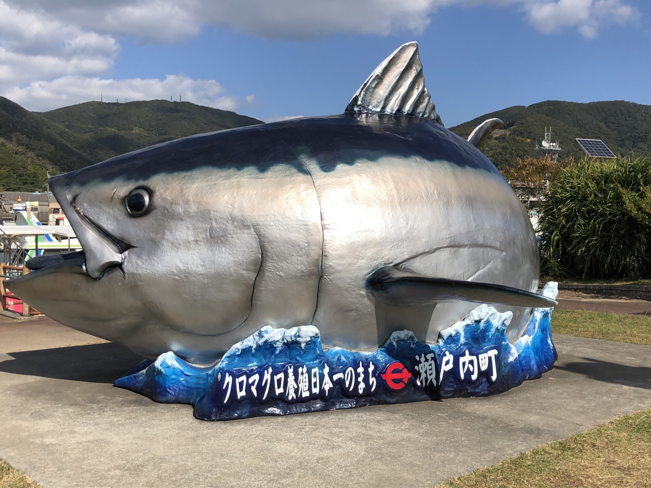 ツアーバスの駐車場でした。外には鮪の銅像「クロマグロの養殖日本一」と書かれたものが置かれていました。1階と2階にはレストラン。2階で「島のお母さん定食」1000円を頂きました。マグロが苦手なので、かんぱちと鯛に替えてもらい、美味しく頂きました。マルシェではポンカン200円を。
