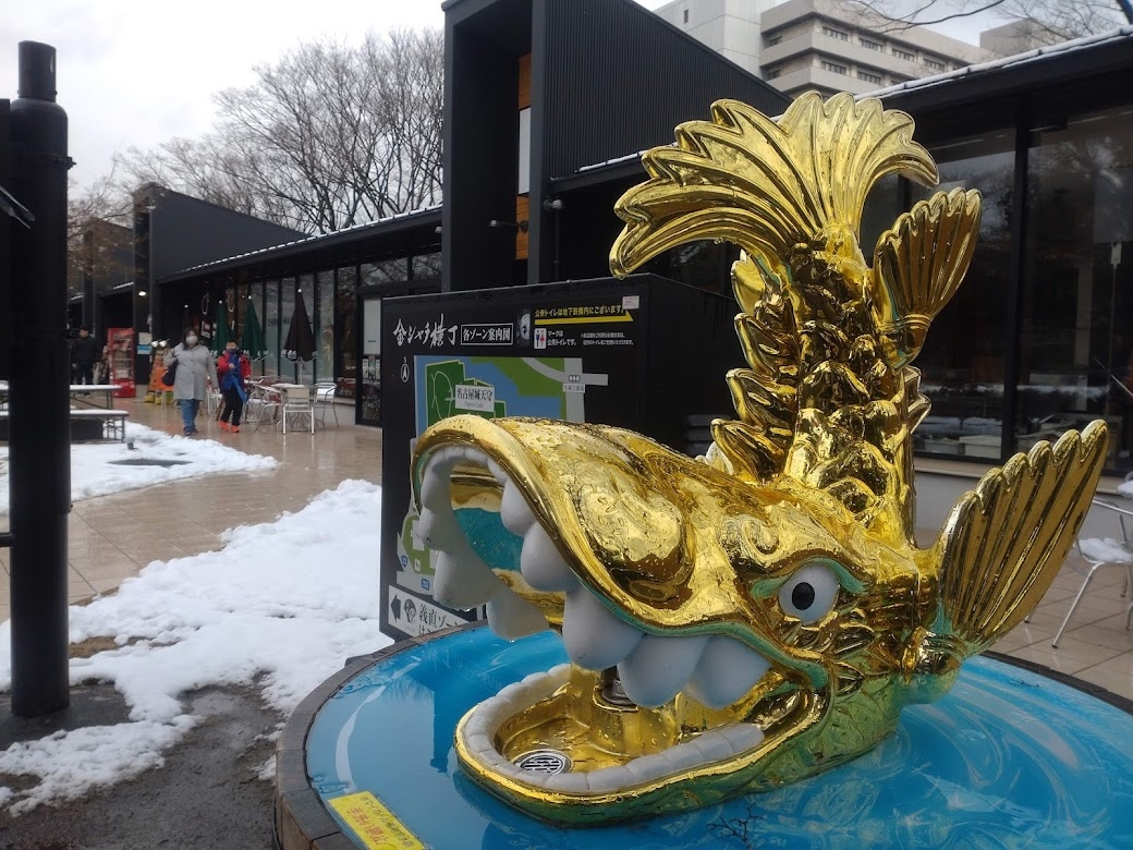 前回(2017年)に訪れたときは工事中で殺風景だったのですが、これを作っていたのですね。市役所駅から名古屋城東門へのアプローチがちょっとにぎやかになっていました。シンボルの金シャチもあって観光客向けです。