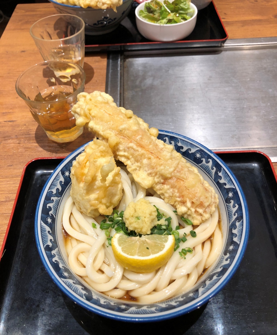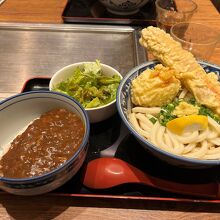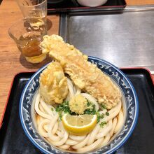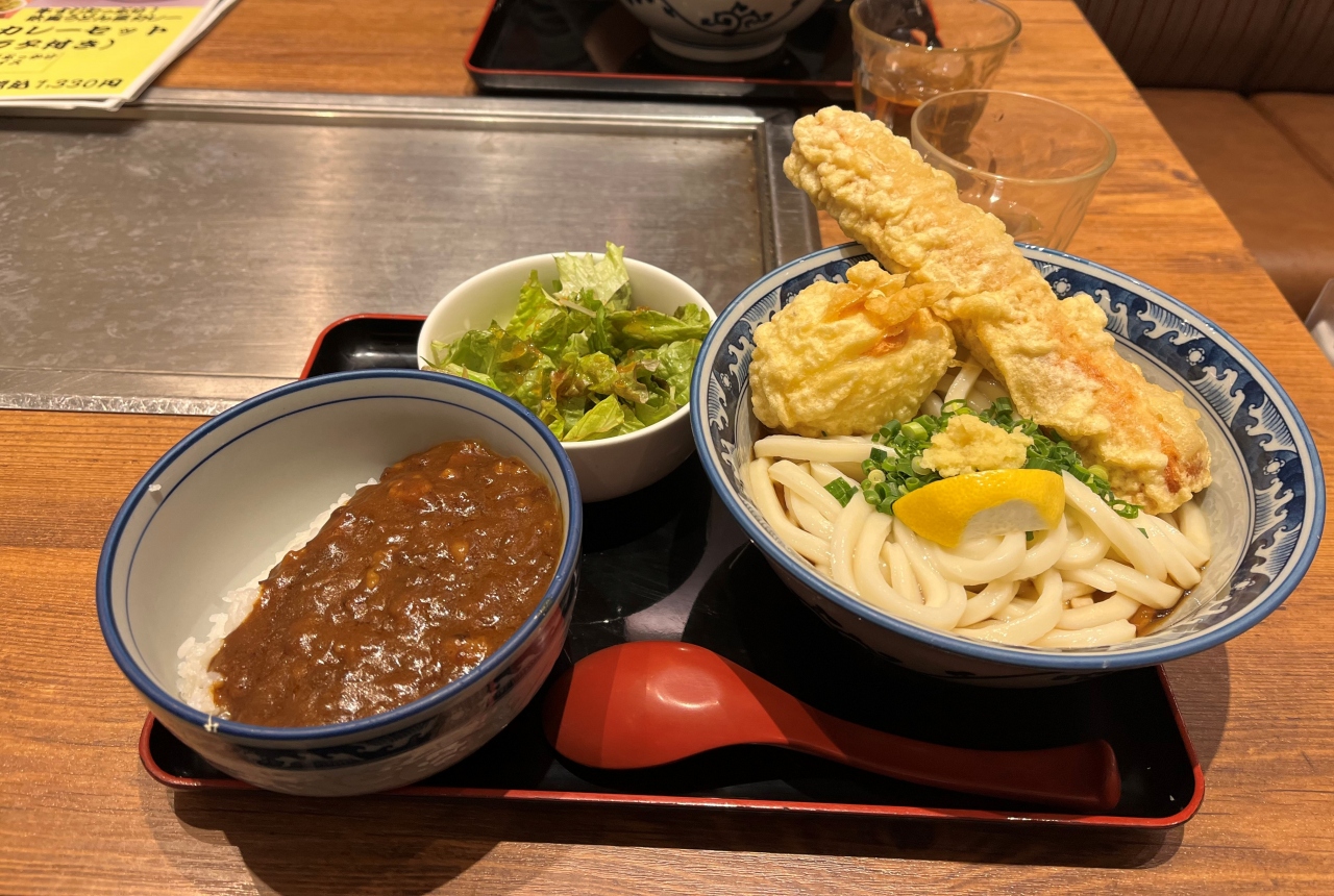 大阪の有名うどん店とお好み焼き店が一つになっているお店です。私は、うどん(ちく玉てんぶっかけ)をいただきました。うどんは、太麺で食べ応えがあり、ちくわと卵の揚げ物ものっているので、かなりのボリュームでした。麺の量は少なめや多めを選べるようになっています。