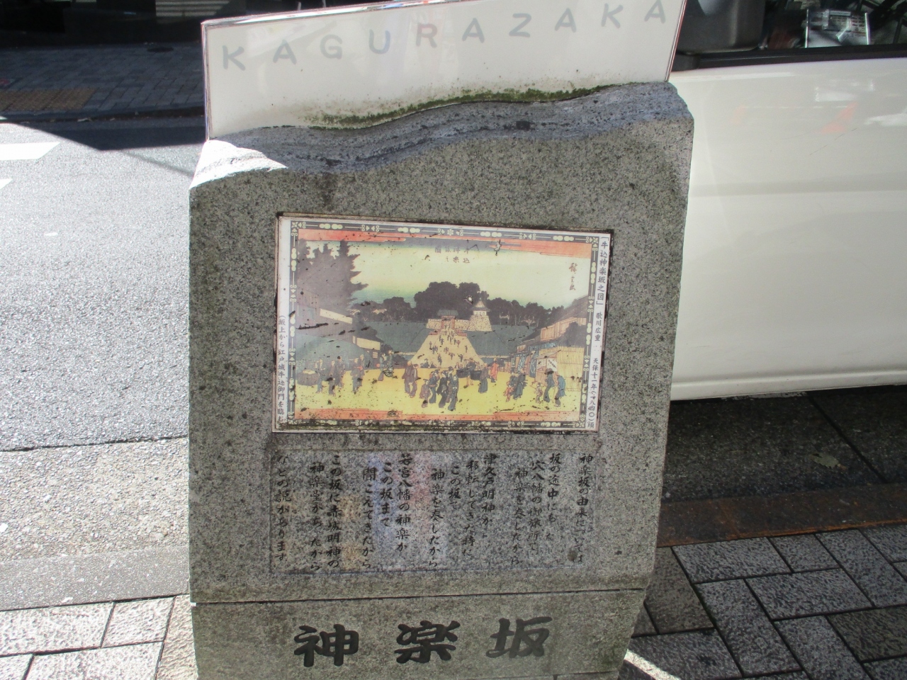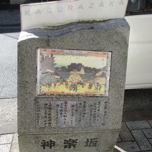 神楽坂通の歩道、ファミリマートの前あたりにカラー図版入りの碑があります。気を付けないと見逃してしまいそうな、大きさが目立たない碑です。碑には江戸時代の神楽坂の様子が描かれています。歌川広重による図だそうです。歴史がある場所なんだなと改めて思いました。
