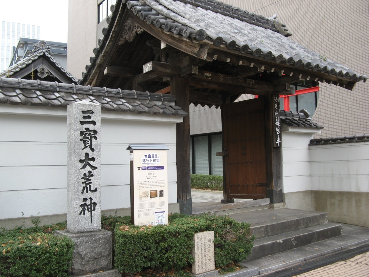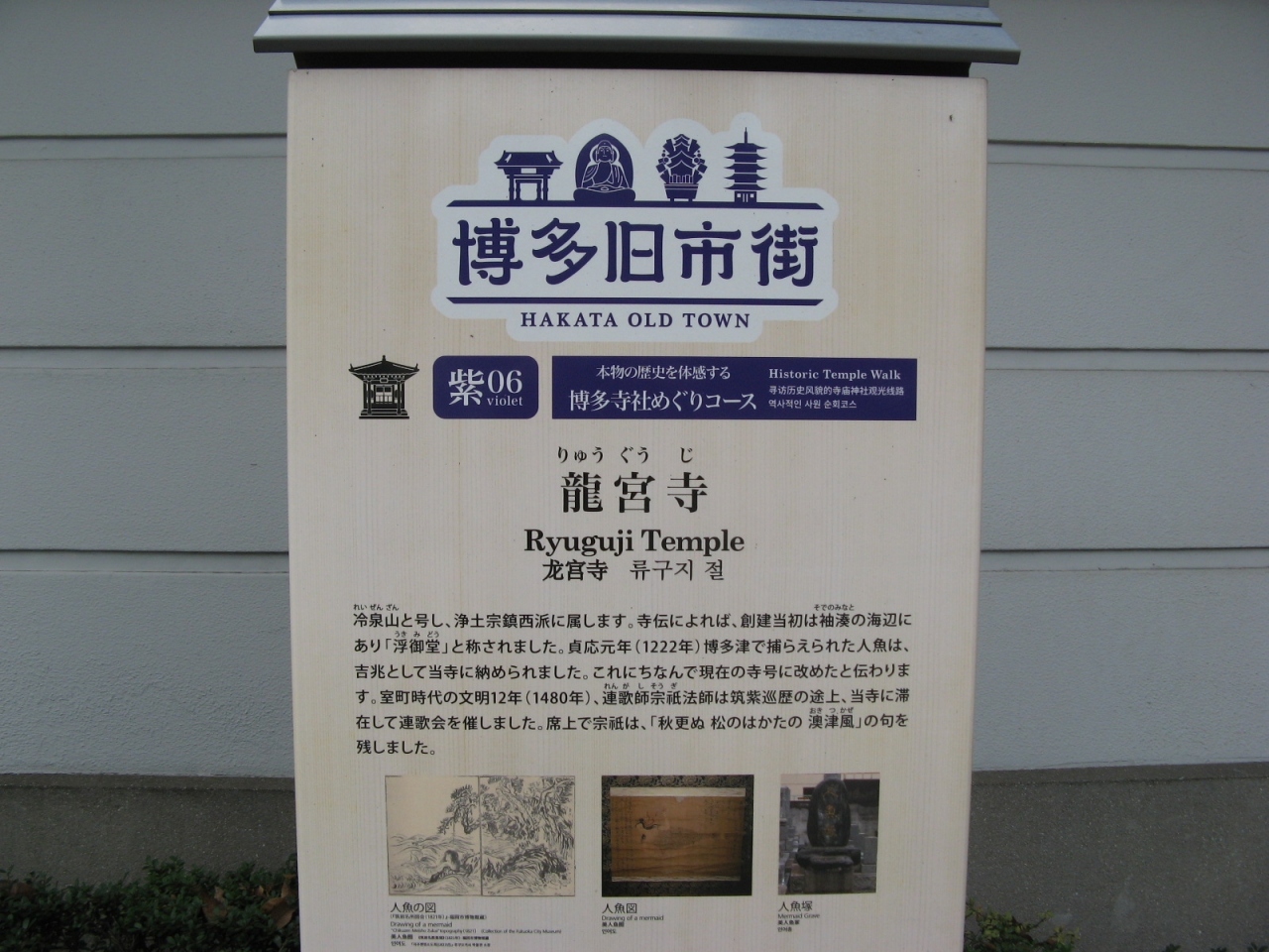 大博通り沿い、東長寺の真向かいにある浄土宗鎮西派のお寺さんです。貞応元年(1222年)に博多の海で捕らえられた人魚を寺内に埋葬しているお寺さんとして有名です。前回、2012年に訪れた時は“福岡オクトーバーフェスト2012”で人魚の骨や人魚の掛け軸などが公開されていて見ることができましたが、通常は公開されておらず今回は見ることができませんでした。お寺の前にある説明板に人魚図などの写真が掲載されています。
