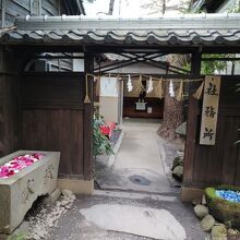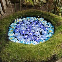 さて、花手水ですが社務所の中庭にはいつもなら2つの手水があるのですが、1つのみしかなく残念。そのかわり社務所の入口の2つはどちらも息を呑むほどの美しさでした。1つはバラを中心とした赤系の花、もう1つは苔生した手水に青系の花たち。いや~ほんとに美しい。いつまでも見ていられます。そして手水舎にも2つ。こちらはかわいらしいという言葉がぴったり。