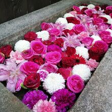 久々に花手水を見に行ってみました。授与所の巫女さんに一声かけると案内してくれました。有り難や…。