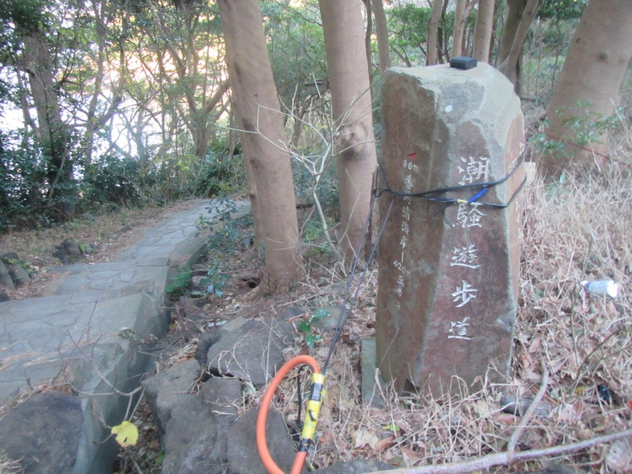 真鶴岬の先端部の南側の岩場の海岸線を行く、幅が1mも無い、階段やアップダウンのある舗装された細道の遊歩道です。