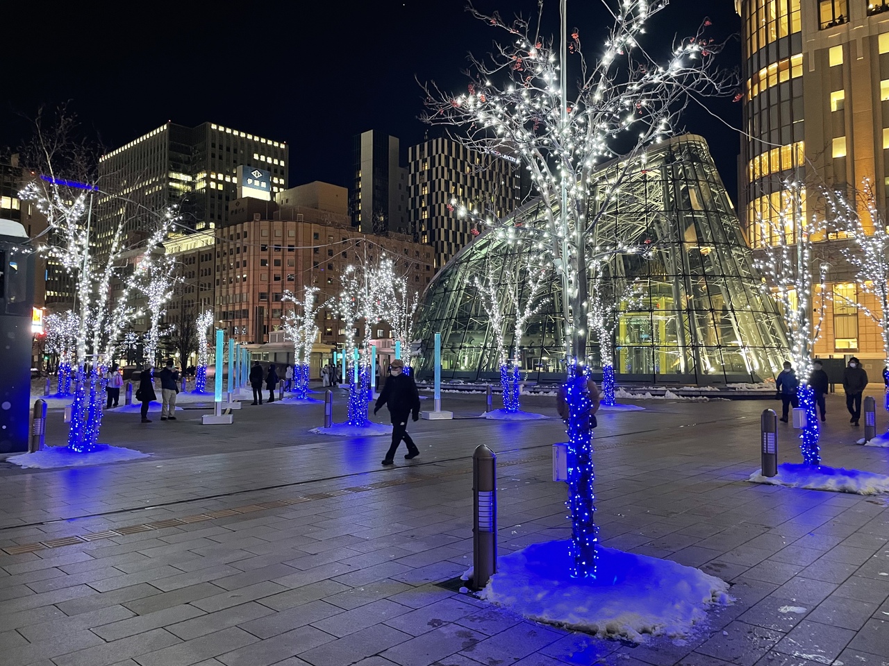 駅ビルと駅前通りの間にある広場。冬はさっぽろホワイトイルミネーションが開催されており、夜は冷えますがきれいです。たくさんの人が写真を撮りに来ていました。季節に合わせて色々なイベントが開催されているのでしょうね!