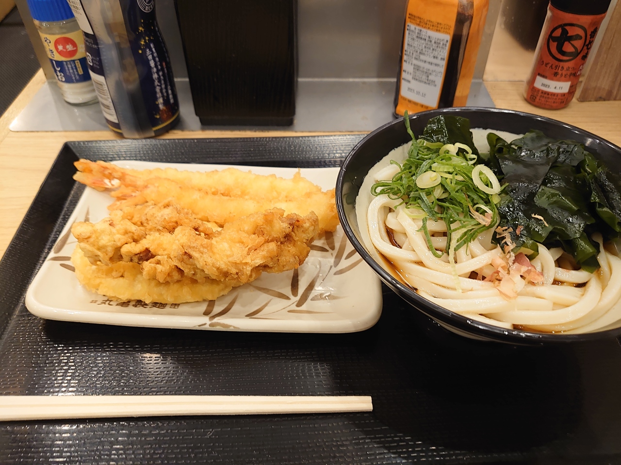 夕飯時に訪れたけど、やっぱりここのうどん屋さんは人気がありお正月機関ということもあって、いつの早朝に来ていた時より人が多かったです。セルフのトッピングのわかめや鰹節や長ネギは変わってなかったけど、過去に特大だったはずのエビがか細くなっていた!味は文句なしですが、これにはちょっと落ち込みました↓↓