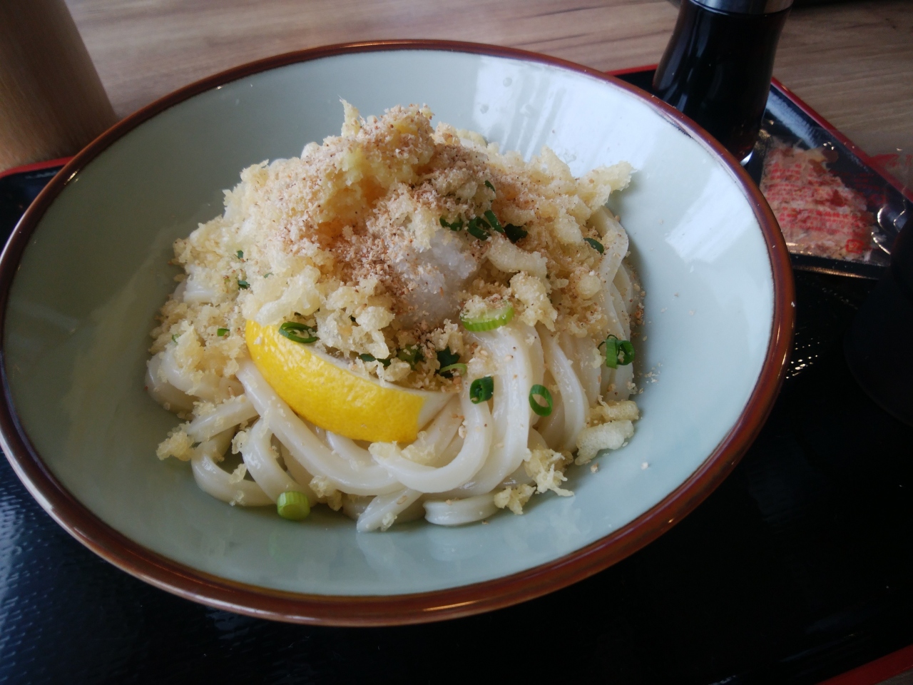 香川県に隣接する岡山市内には数多くの讃岐うどん店が存在する。ここは典型的なセルフ式讃岐うどんの食堂だ。窓口で注文し、トッピングの天ぷらやおにぎりなどサイドメニューを選び、レジでうどんを受け取り、支払う。最後は天かすや七味だ。窓口から受け取りまでがシンプルで、本場に近いスタイル。この日はしょうゆうどんの「中」をオーダーしたが、腰はあるが比較的柔らかい麺で、まずまず。昼食時だったが、とても人が多く、人気店なのには驚いた。