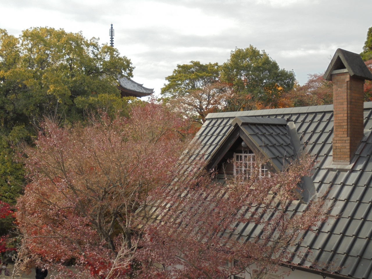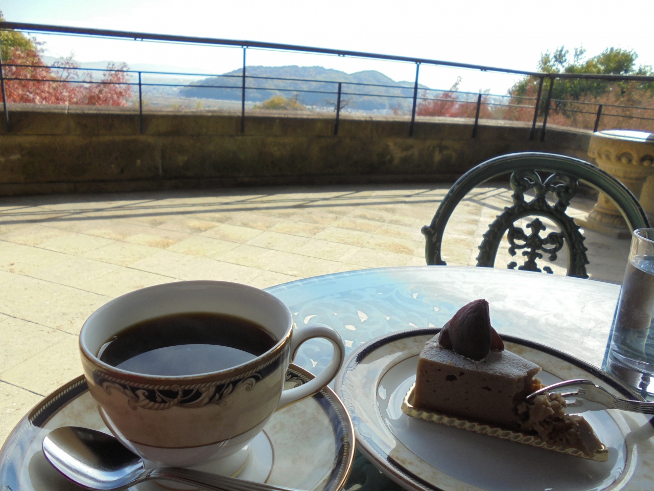 ここからは遠方に広がる景色や三重塔が右手に見えます。ケーキとコーヒーのセットをオーダー。素晴らしい景色を見ながらのコーヒータイムは至福のひとときとなりました。