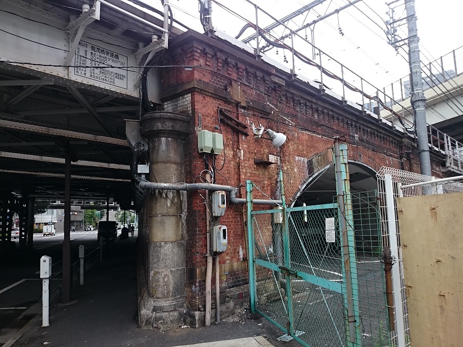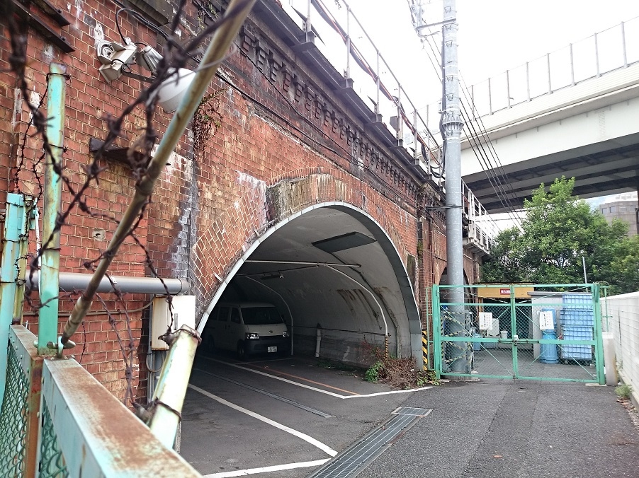 JR東京駅丸の内北口から徒歩10分程度、日本橋川を渡る外濠橋梁と龍閑橋架道橋までの間のJR線路の高架部分が龍閑河岸高架橋です。アーチの下のスペースは駐車場の様になっていて車が停まっていました。この辺りの高架橋は赤レンガの壁のままです。