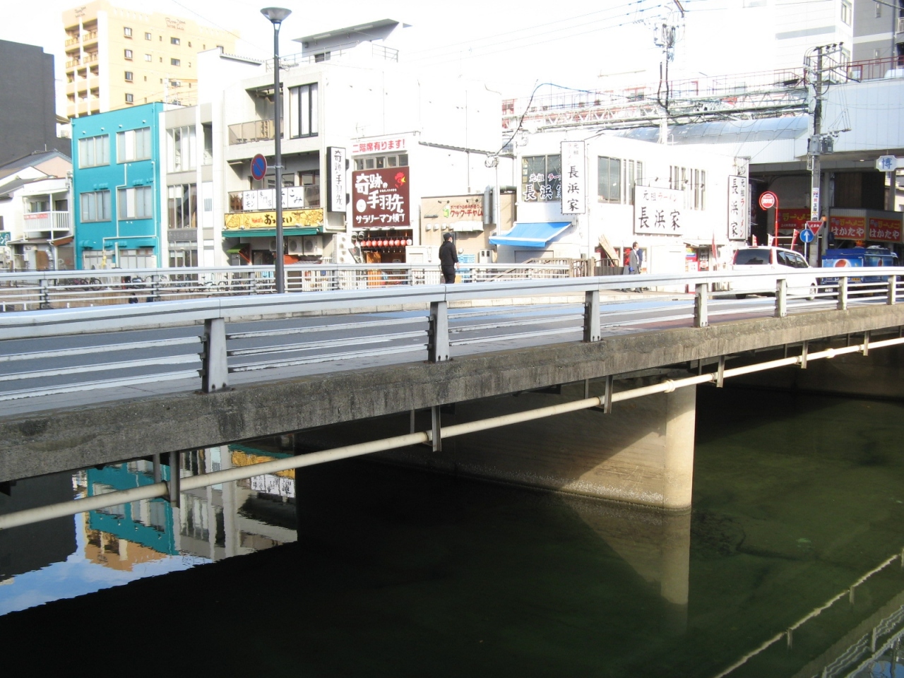 博多川に架かる川端商店街と中州を結ぶ橋です。車道と歩道のある小さな橋でこれと言った特徴はありません。川沿いに降りることができる階段があるので博多川に沿って散策も楽しめますが、いずれにしても橋自体を観光するような風情はありません。