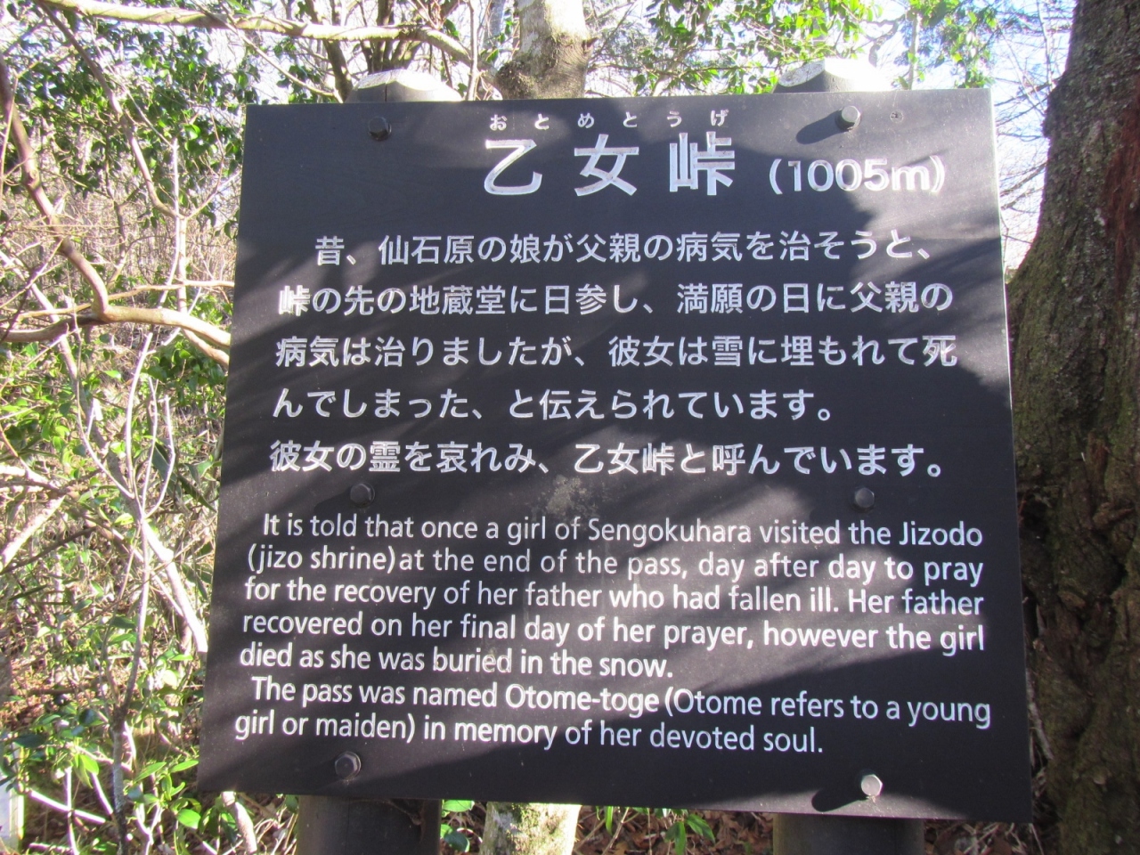 静岡県側の乙女峠バス停から登った感じでは、標高約800mのバス停から樹林下の石ゴロゴロの登山道を標高1005mの峠までじわじわと登っていく感じでした。峠では景色を見るための小さな展望デッキと、分岐の金時山側に屋外テーブル席があって箱根山方面を少し望むことができましたが、当然のことながらお店や自販機などはありません。