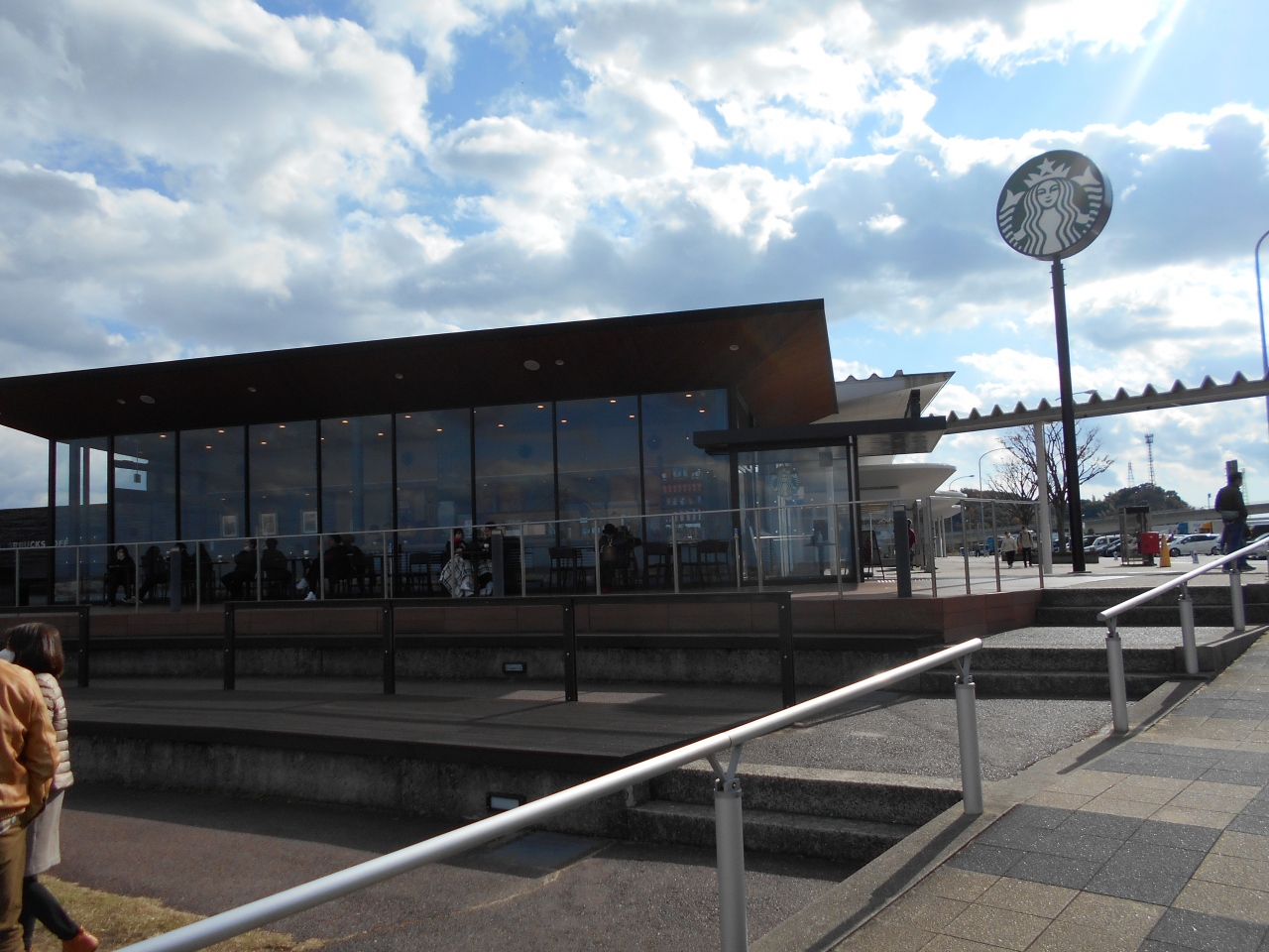 神戸淡路鳴門自動車道淡路IC下り線にある景観抜群のスターバックスコーヒー。街中のスタバと違って目の前に明石海峡の激しい潮流と世界に誇る吊り橋・明石海峡大橋が見える立地です。スケール大きな景観がコーヒーの味を高めてくれます。