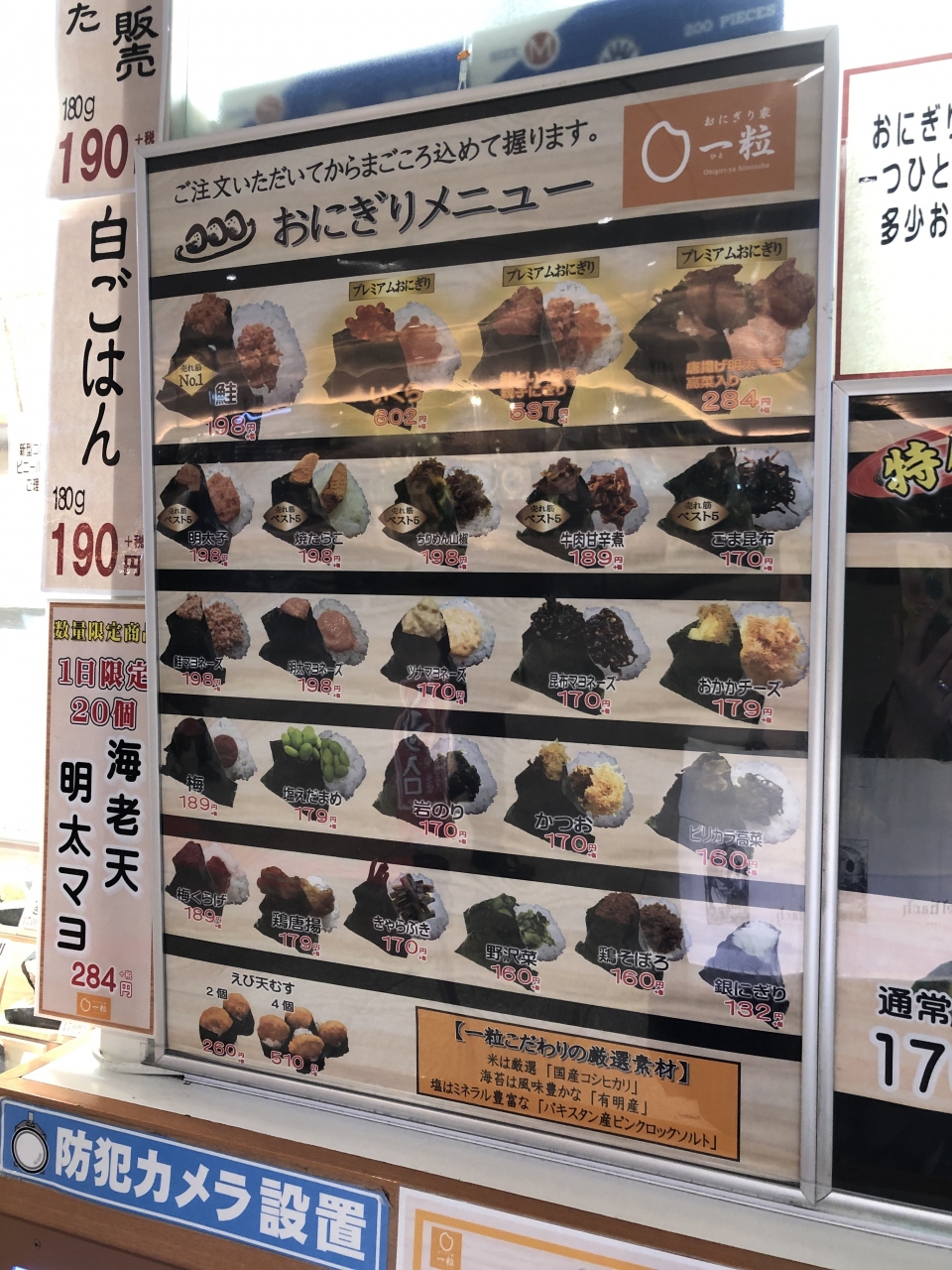 ホテルに向かう前に購入。具の種類がたくさんあるので、選ぶのが楽しいです。この時はツナマヨネーズ(税抜き170円)と梅(税抜き189円)にしたんだったかな? その場で握ってくれるのに、100円台はお安いと感じました。時間が経ってもお米のふっくら感は変わらず、通りがかりに買ってよかったな~と大満足です。