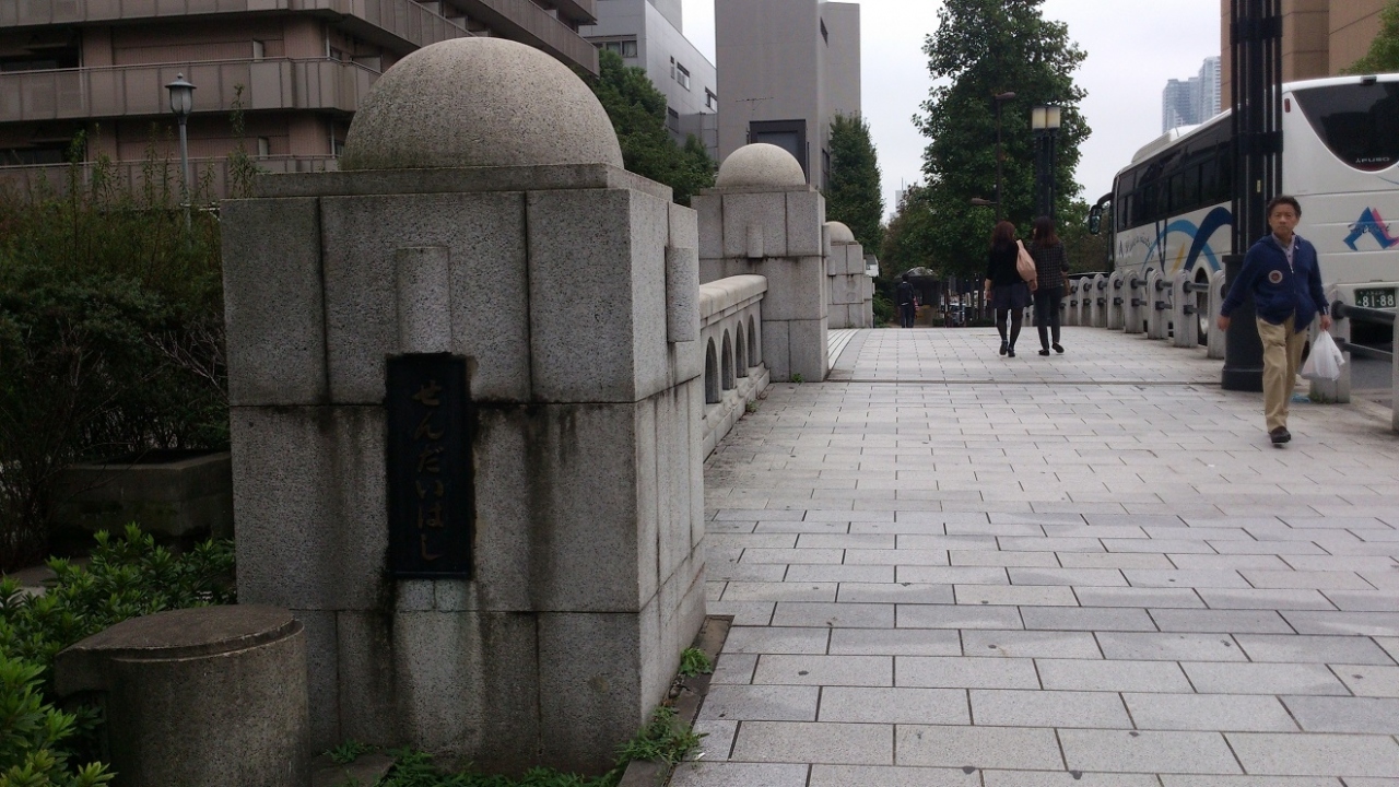 築地駅から徒歩10分程度、銀座7丁目と8丁目の間の中央市場通りが首都高速道路を渡る橋が千代橋です。かつては築地川の支流が流れていましたが、首都高速道路建設の際に埋め立てられてしまいました。平成12年都営地下鉄大江戸線工事の際に橋も整備され、現在は綺麗な 橋になっています。