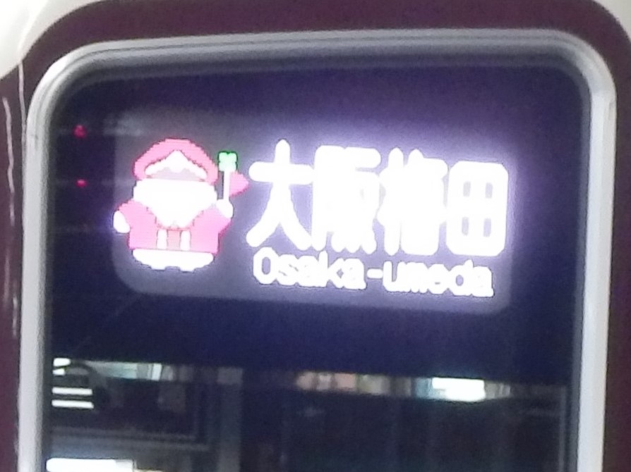 阪急電鉄色マルーンカラーの制服を着たコウペンちゃんが入口ドアーの両側に貼り付けられているほか先頭車の行き先表示板にLEDでコウベちゃんのイラストが表示 小さくて気づき難いです、このようなイラスト表示は、今まで"くまのがっこう"、"すみっこぐらし"等がありました、今回のはかなり派手ですごく人気があるようですが、神戸線、宝塚線、京都線に各一列車のみなので見つけるのは困難です、2022/1/31まで運行されます