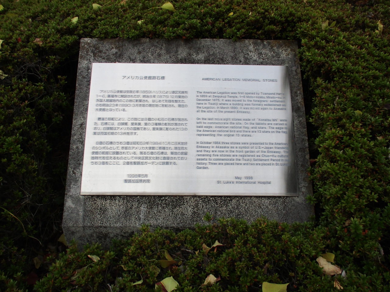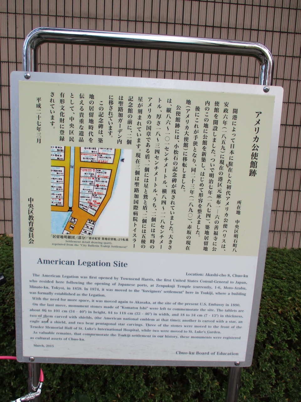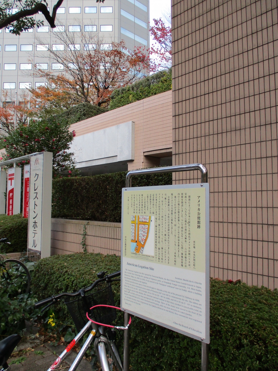 聖路加ガーデンタワー近くを散策していて、案内板に目が留まりました。かつてアメリカ公使館がこの場所にあった案内板でした。聖路加病院の敷地内にもアメリカ公使館石標として、星のマークなどの記念碑がありました。いずれにしても、この辺りが外国人居留地だったので、アメリカの公的な施設があったに違いありません。建物の痕跡などは無かったので、当時の建物がどんな様子だったかはわかりませんでした。