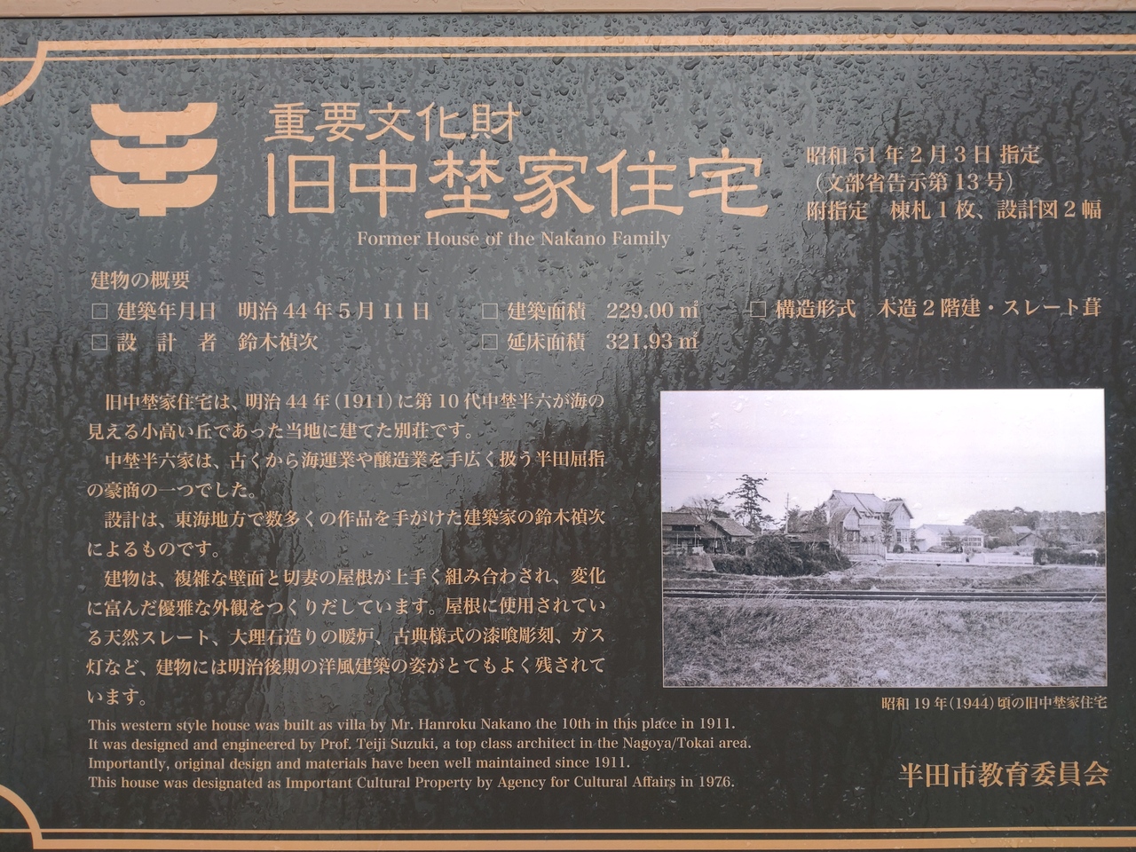 旧中埜半六邸とは真逆で完全に洋風の別邸です。前面の壁に柱組を見せる装飾はドイツのロマンチック街道で見たものに似ていました。外観を見るだけでしたが、それでも十分に楽しめました。駐車場が見つからなかったので車でアクセスするときは近隣の駐車場を調べておくといいでしょう。