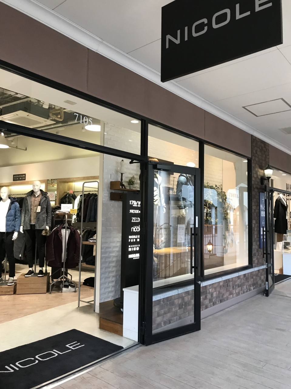アウトレット店とはいえ、ニコルの店舗は、一つ一つの製品が個性的でじっくり見たいものばかりです。若者向きのファッションブランドですが、色合いがシックなものが多く、年配の女性たちでも着れそうなものも多く、トックリのセーターは特に素敵でした。
