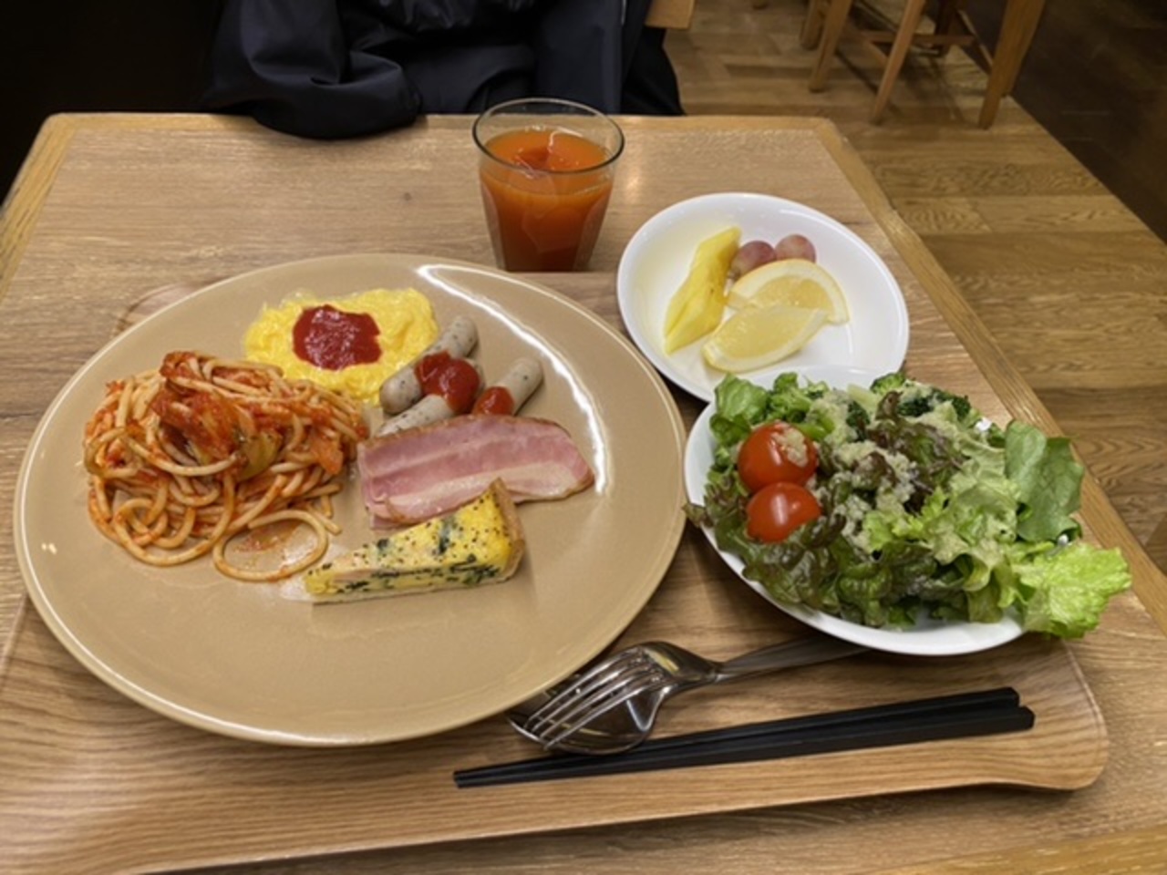 朝食は和洋折衷でした。サラダが新鮮で良かったですね。トマトソーススパゲッティにキッシュ、ベーコン、ソーセージ。バジルカレーも食べました。
