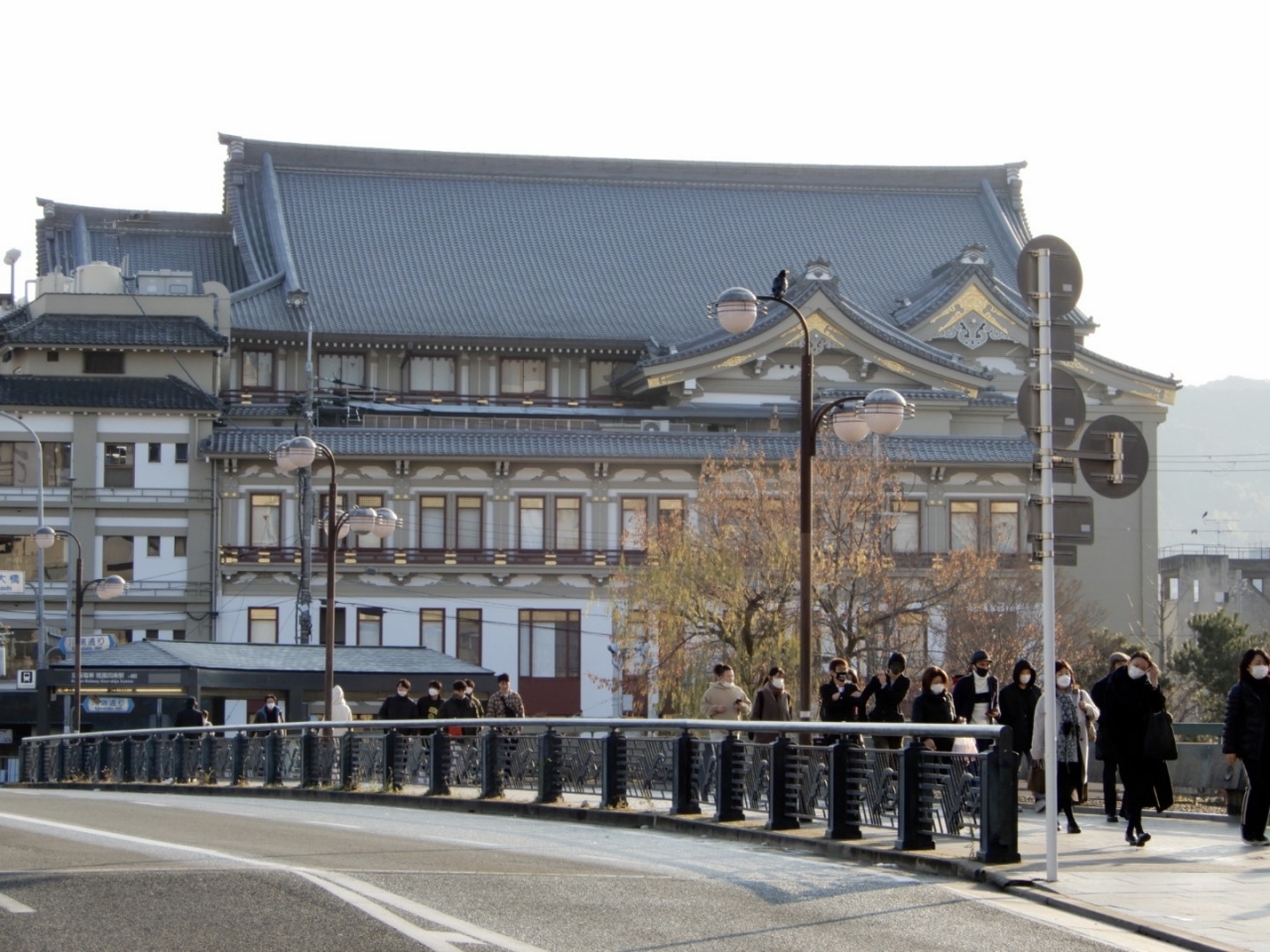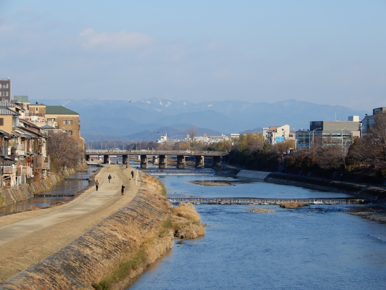 鴨川のせせらぎ、付近の店舗、遠景の山並み