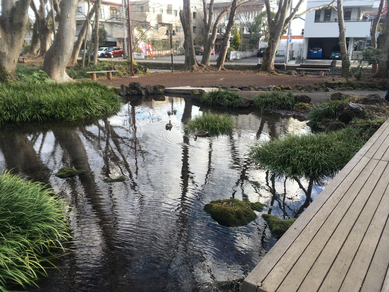 三島駅南口から徒歩で5~6分ほどです。楽寿園の正門の道路を挟んで向かい側です。街の中にありながら、溶岩に覆われた森の中に小川が流れるという恵まれた環境にある公園です。昔、滝のように湧水が流れていたことからこの名前がつけられたそうです。木橋やベンチもありました。付近を桜川が流れています。