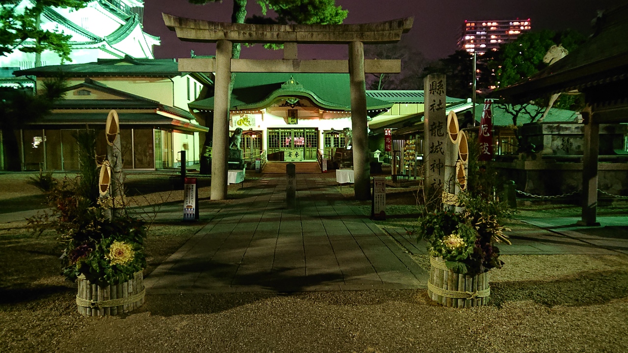 年末の時期の、夕方遅くに訪問しました。こちらの神社の立地する、岡崎公園内でイルミネーションイベントが開催されていることもあり、境内には一定の人出が見受けられました。門松が飾られており、新年近し、の印象を受けました。